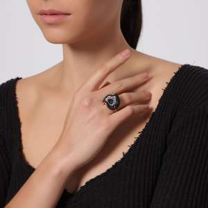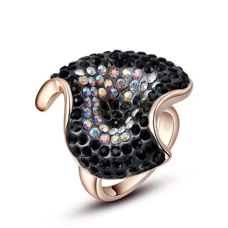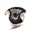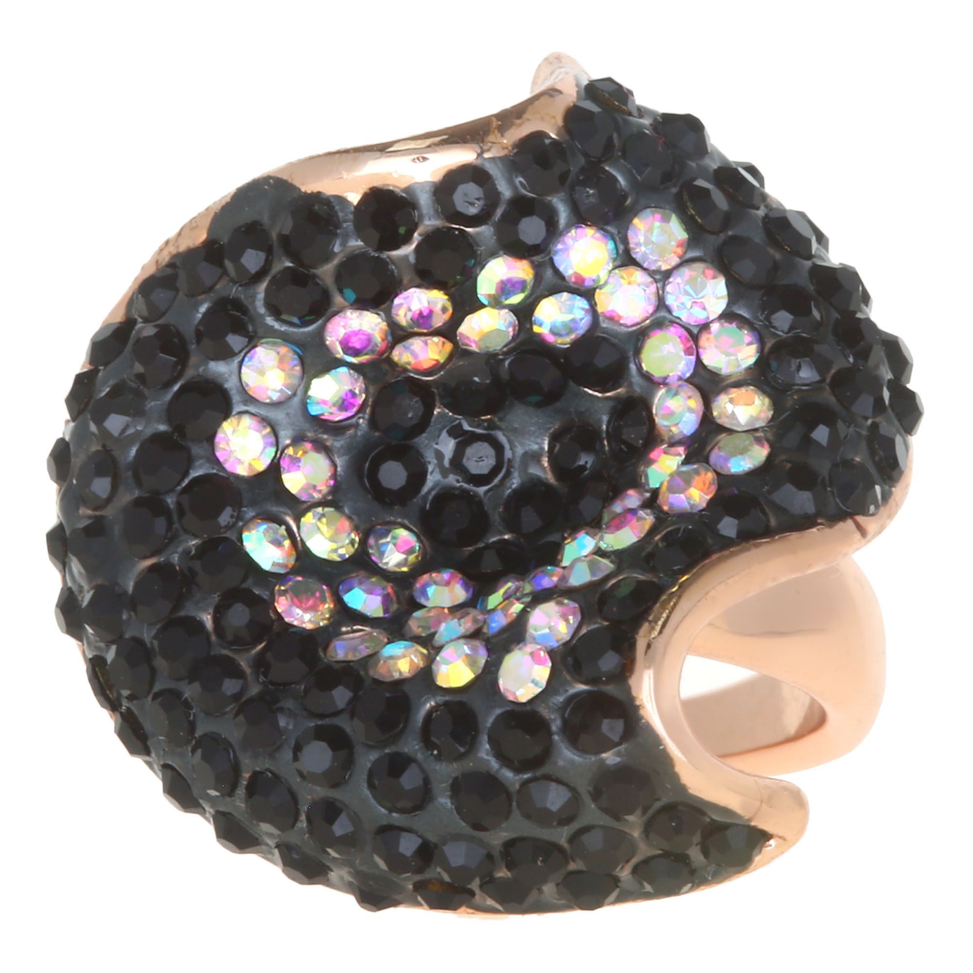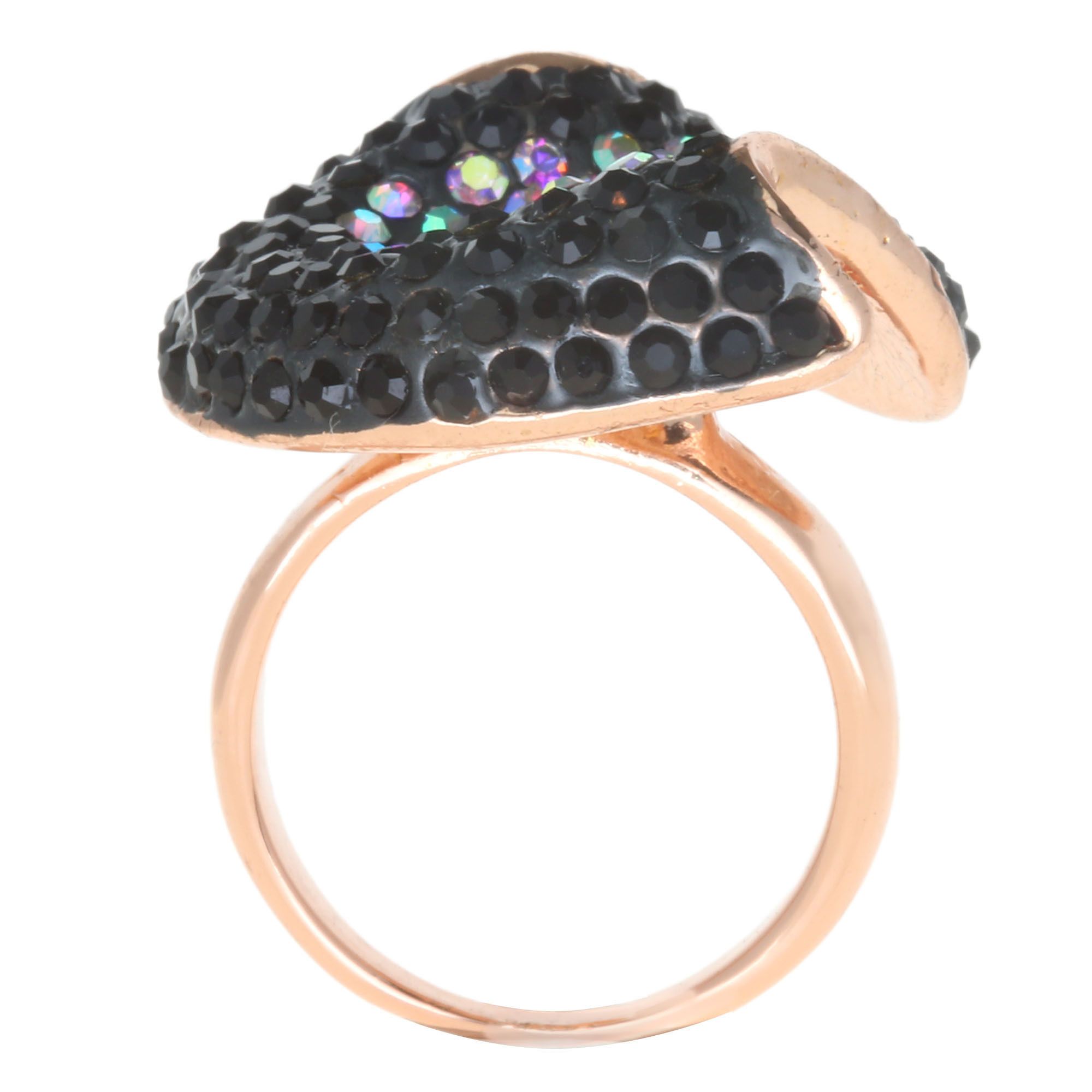 Precioso anillo en baño de oro rosa de 18 quilates, fino diseño de hoja estilizada, con incrustaciones de cristales en color negro y tornasol. Fabricado en una estructura de aleación de platino con rodio sin níquel.