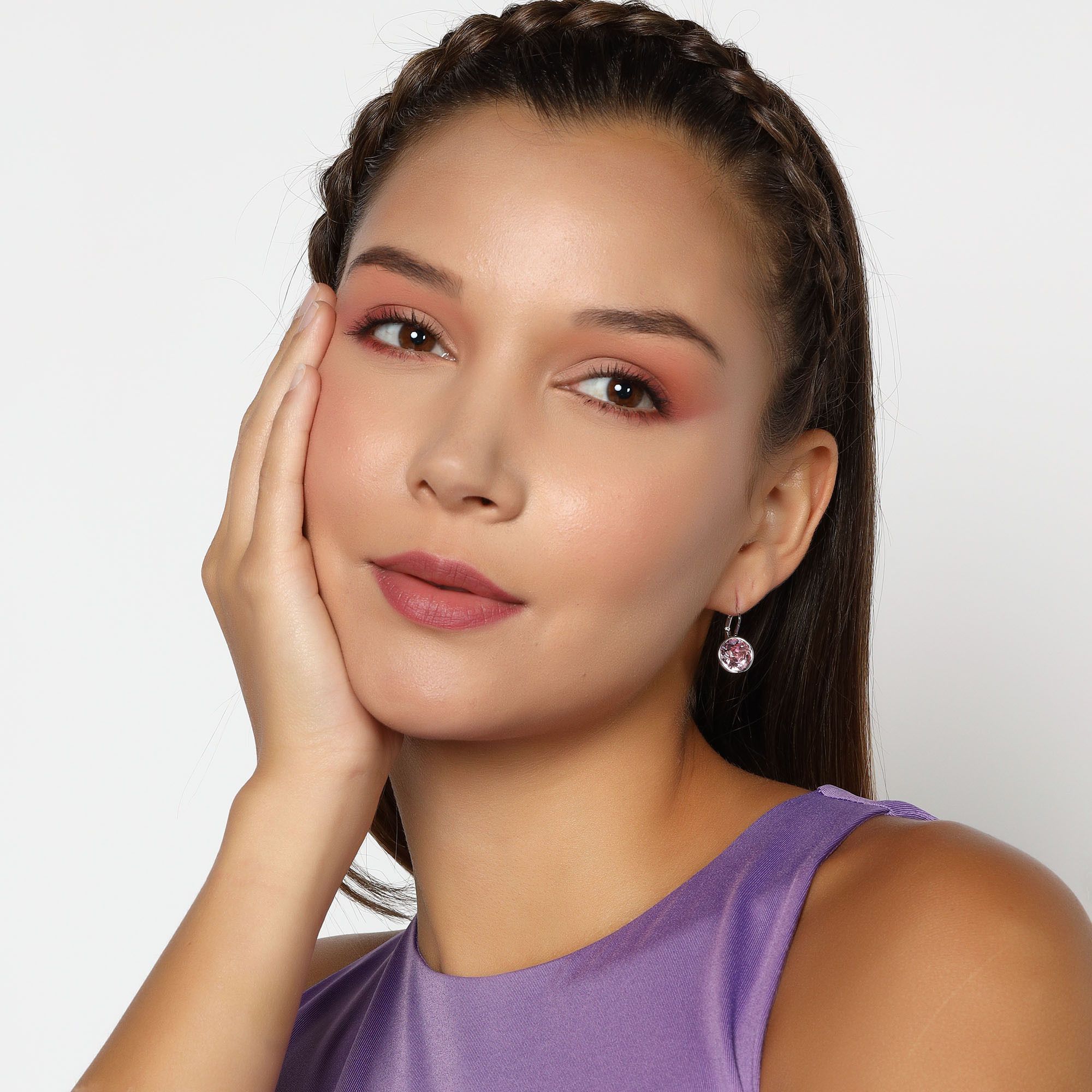 Lindos aretes en baño de oro blanco de 18 quilates, con cristal corte brillante en color rosa. Fabricado en una estructura de aleación de platino con rodio sin níquel.