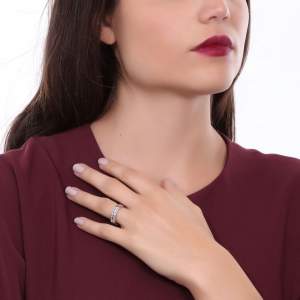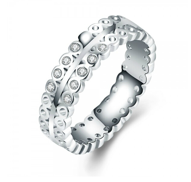 Anillo en baño de oro blanco de 18 quilates, fino diseño, con detalles calados e incrustaciones de cristales en color blanco. Fabricado en una estructura de aleación de platino con rodio sin níquel.