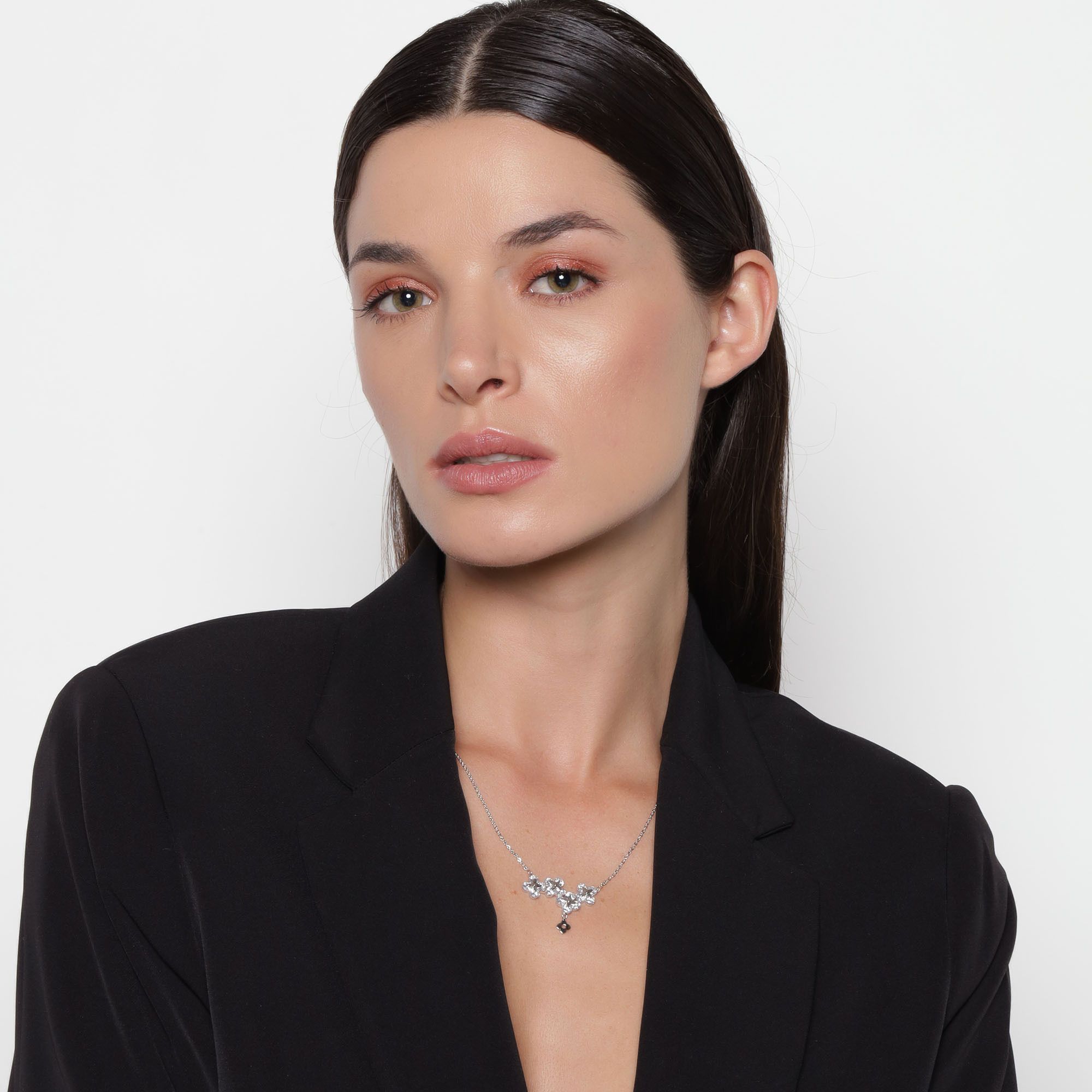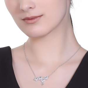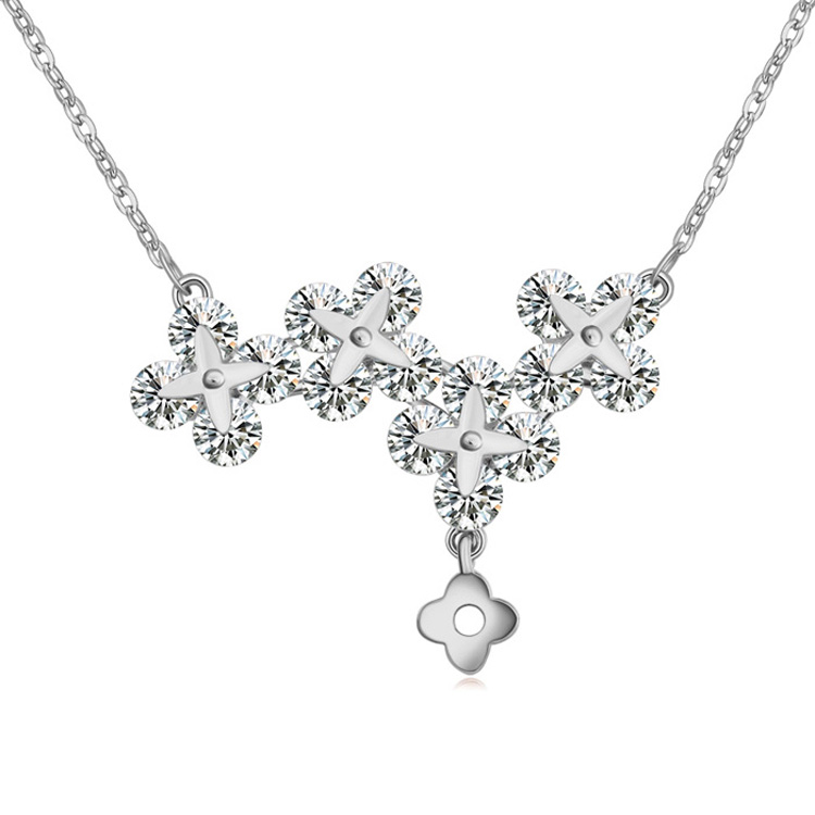Lindo collar en baño de oro blanco de 18 quilates, detalle de flores con incrustaciones de cristales en color blanco. Fabricado en una estructura de aleación de platino con rodio sin níquel.