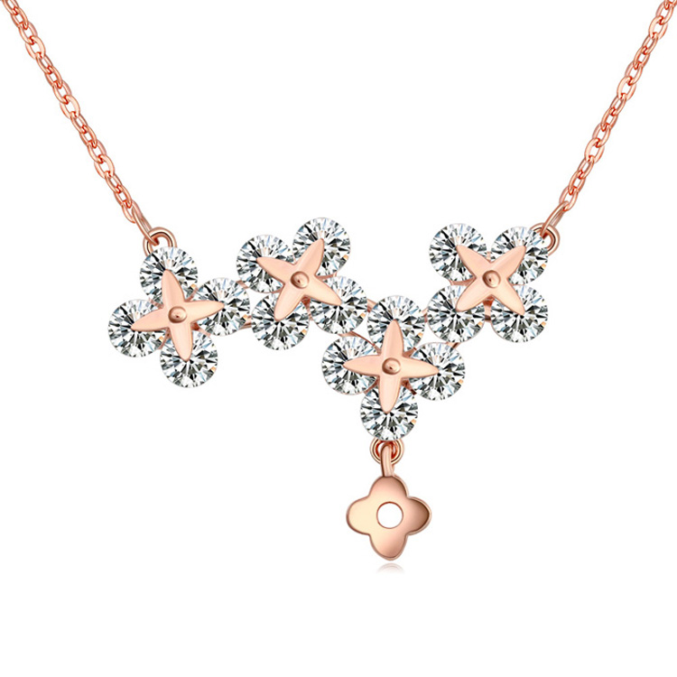 Lindo collar en baño de oro rosa de 18 quilates, detalle de flores con incrustaciones de cristales en color blanco. Fabricado en una estructura de aleación de platino con rodio sin níquel.