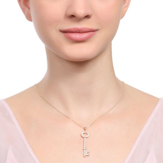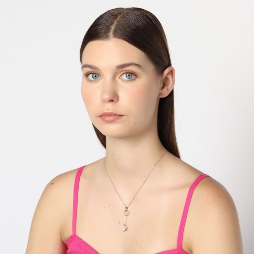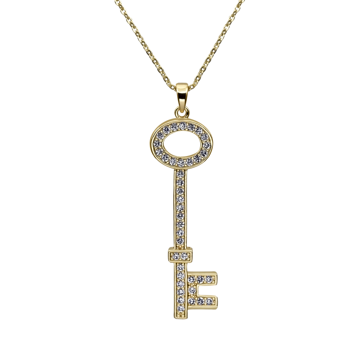Dije con cadena en baño de oro amarillo de 18 quilates, diseño de llave con incrustaciones de cristales en color blanco. Fabricado en una estructura de aleación de platino con rodio sin níquel.