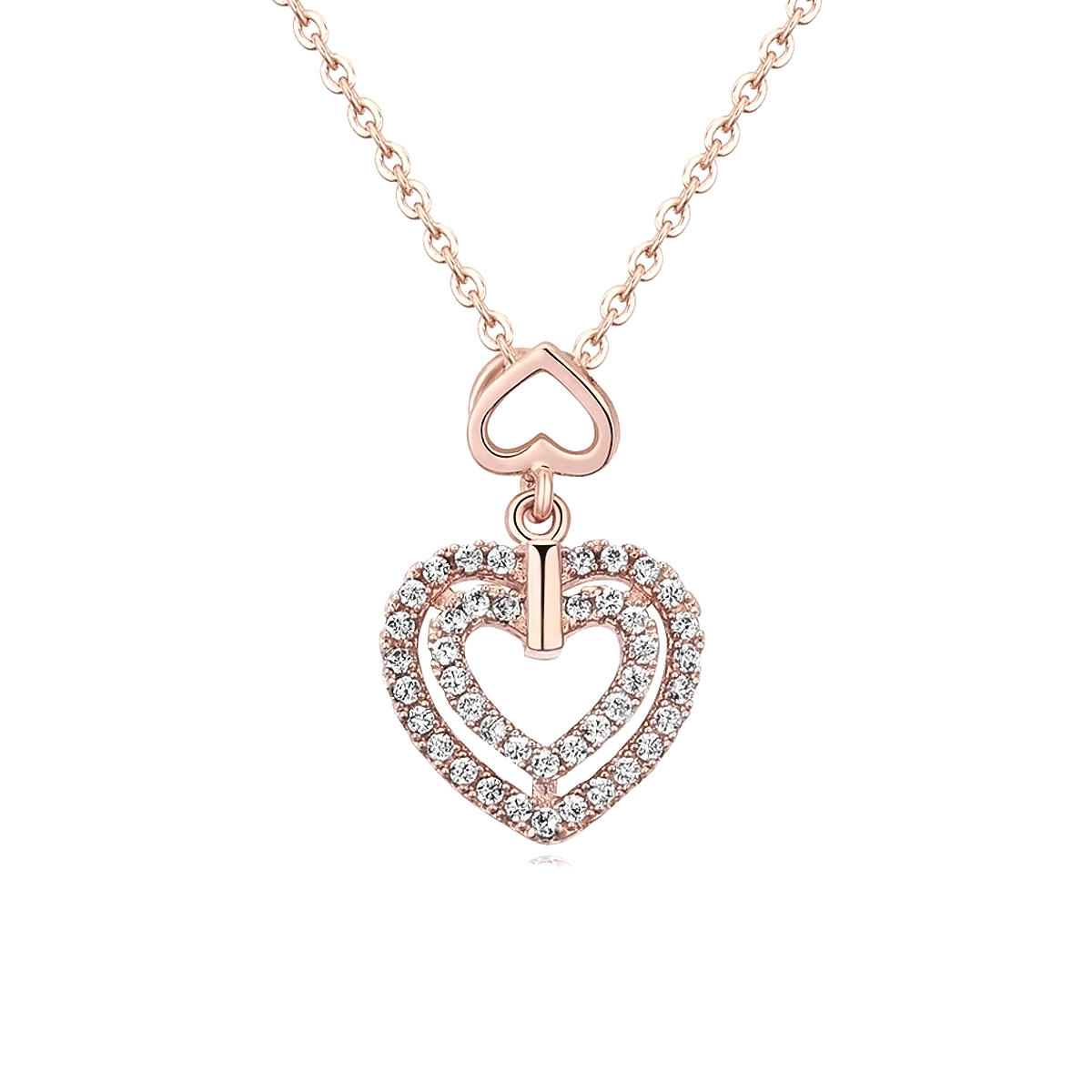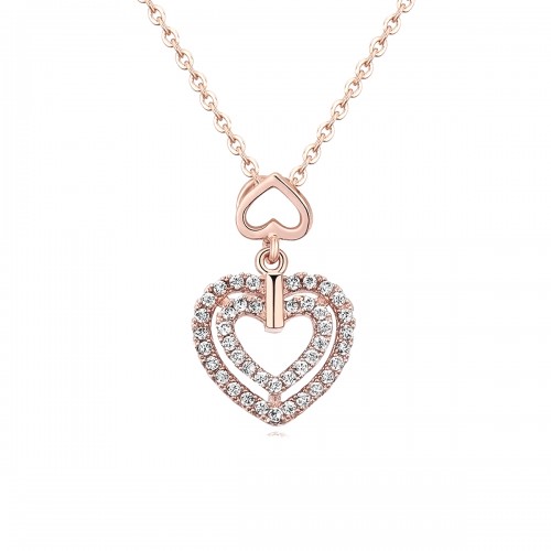 Precioso dije en baño de oro rosa de 18 quilates, diseño de corazones con incrustaciones de cristales blancos. Fabricado en una estructura de aleación de platino con rodio sin níquel.