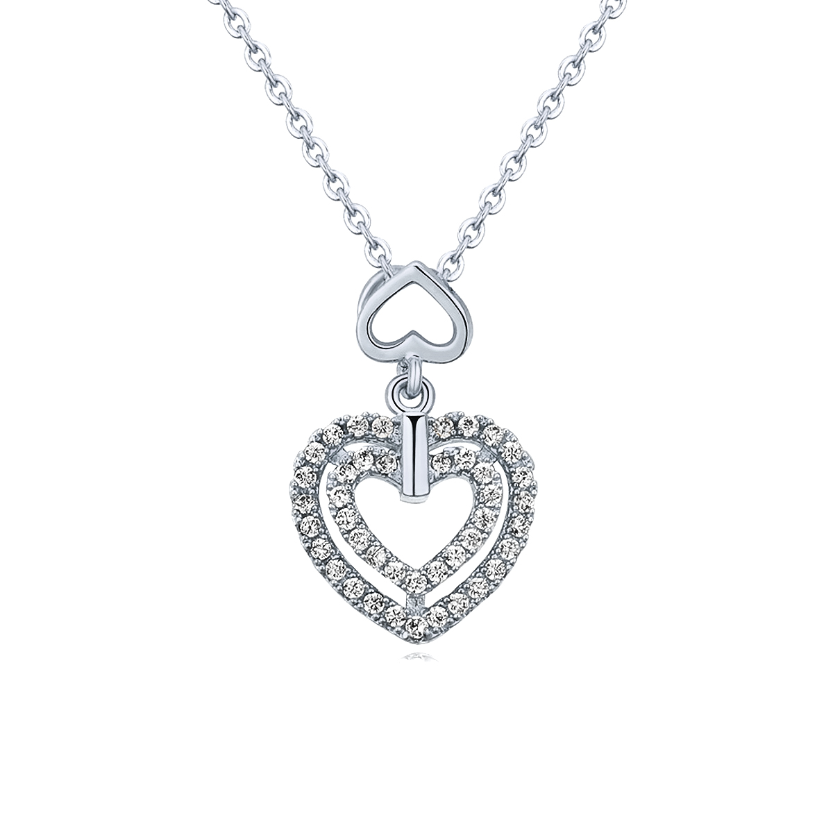 Precioso dije en baño de oro blanco de 18 quilates, diseño de corazones con incrustaciones de cristales en color blanco. Fabricado en una estructura de aleación de platino con rodio sin níquel.