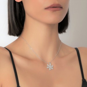 Elegante dije en baño de oro blanco de 18 quilates, fino diseño de copo de nieve con incrustaciones de cristales en color blanco. Fabricado en una estructura de aleación de platino con rodio sin níquel.