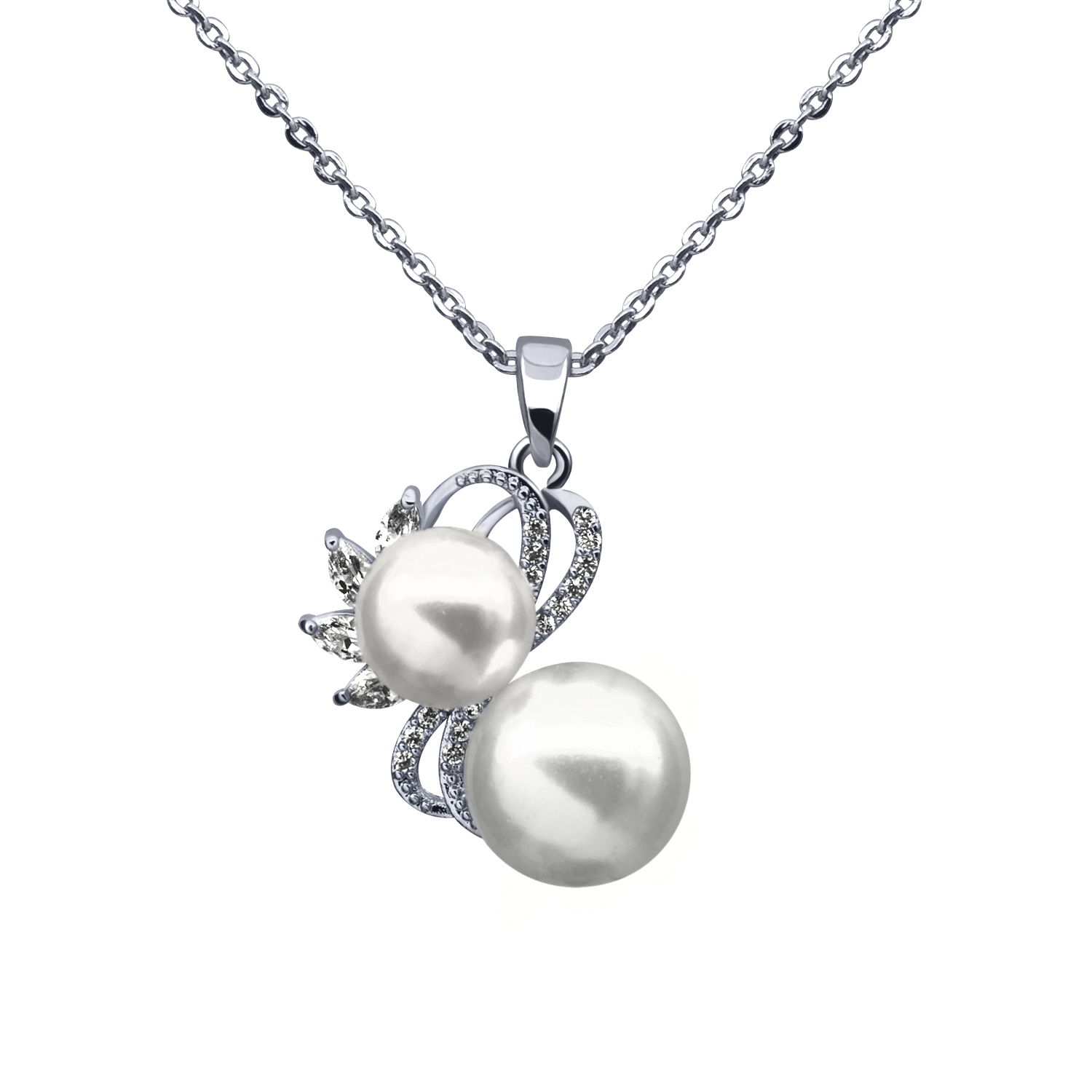 Dije con cadena en baño de oro blanco de 18 quilates, fino diseño con detalle de perlas e incrustaciones de cristales en color blanco. Fabricado en una estructura de aleación de platino con rodio sin níquel.