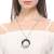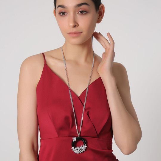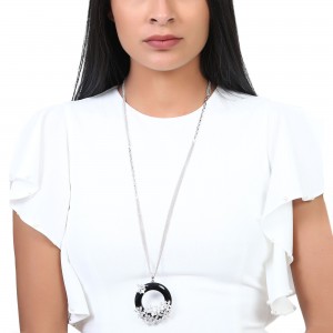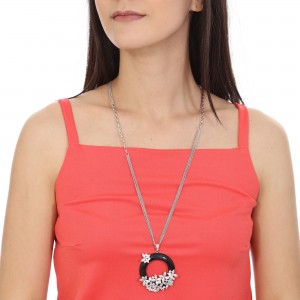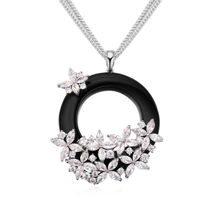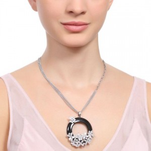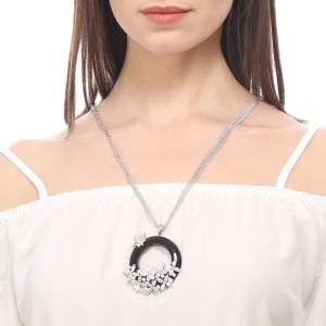 Lindo collar para sweater en baño de oro blanco de 18 quilates, diseño de aro esmaltado en color negro con flores plateadas e incrustaciones de cristales en color blanco. Fabricado en una estructura de aleación de platino con rodio sin níquel.