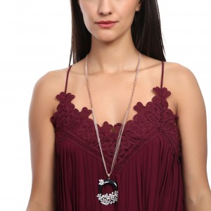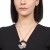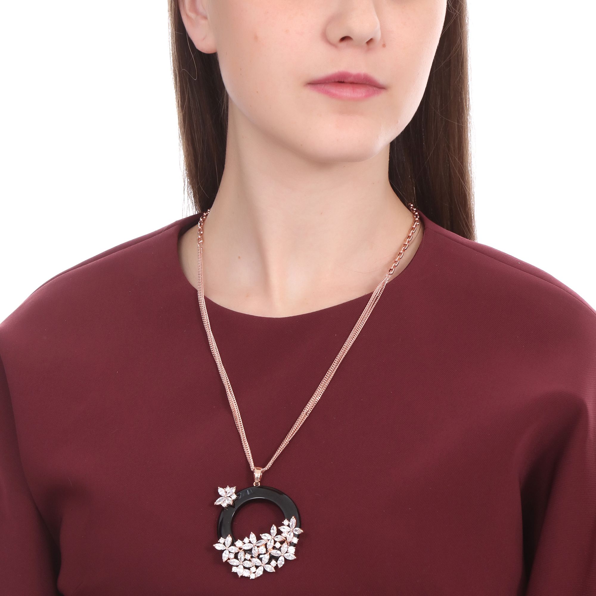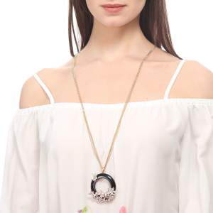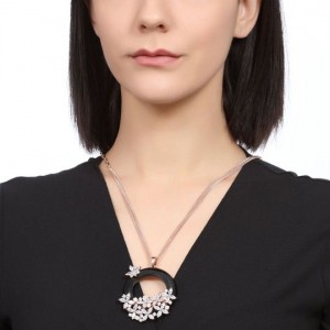Lindo collar para sweater en baño de oro rosa de 18 quilates, diseño de aro en esmaltado color negro con flores rosadas e incrustaciones de cristales en color blanco. Fabricado en una estructura de aleación de platino con rodio sin níquel.