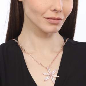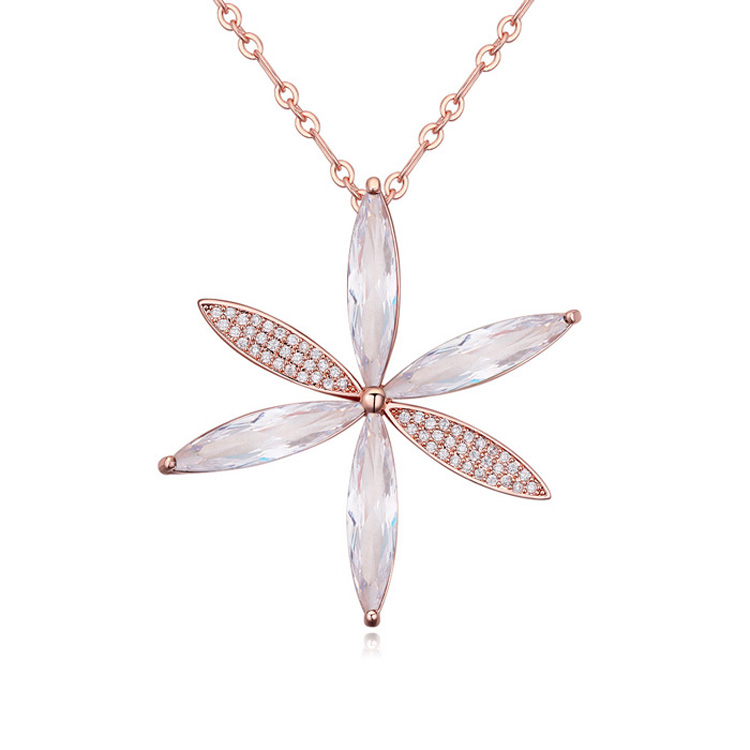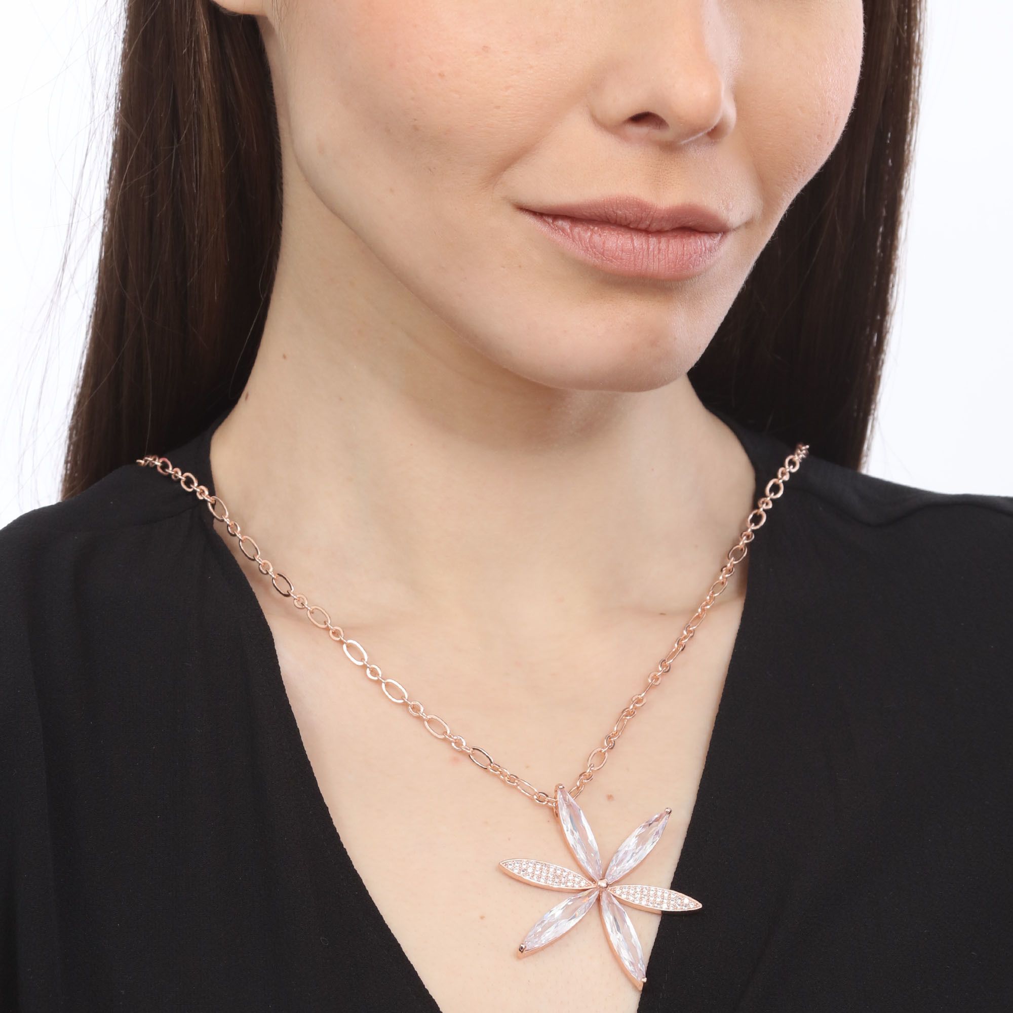 Collar en baño de oro rosa de 18 quilates, diseño de flor con cristales blancos corte marquesa e incrustaciones de cristales en color blanco. Fabricado en una estructura de aleación de platino con rodio sin níquel.
