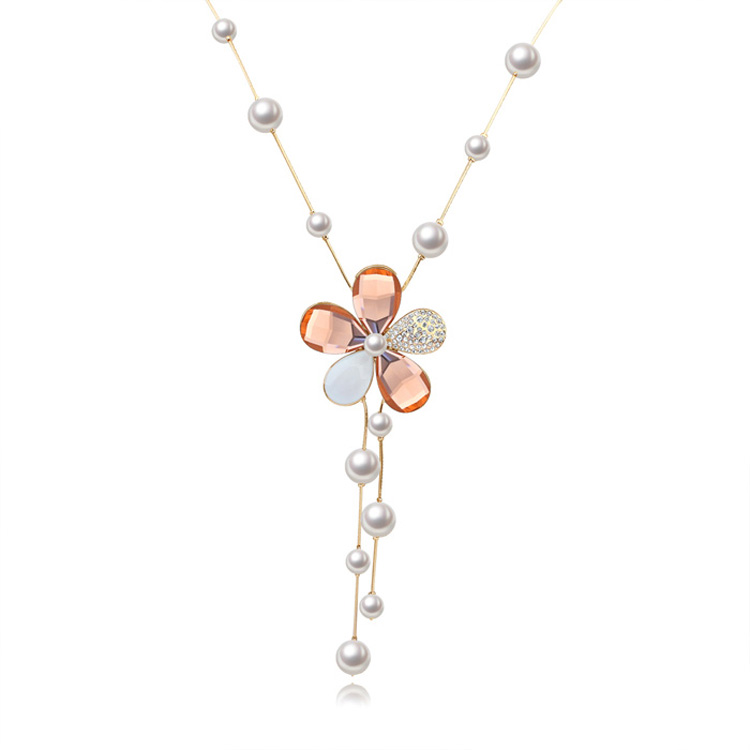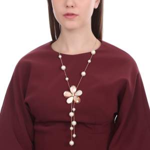 Hermoso collar en baño de oro amarillo de 18 quilates, fino diseño de flor con detalle de perlas blancas e incrustaciones de cristales en color blanco y ámbar. Fabricado en una estructura de aleación de platino con rodio sin níquel.