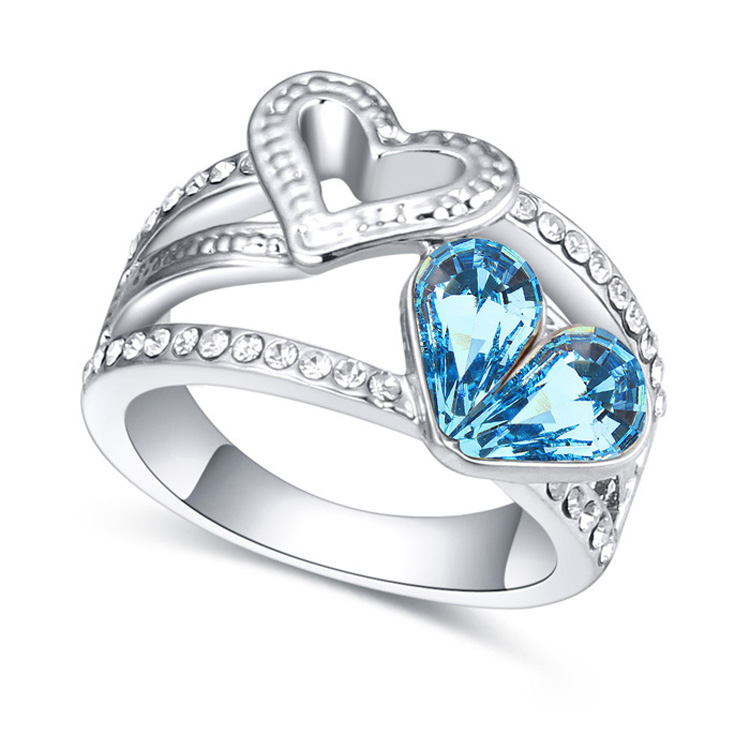 Lindo anillo en baño de oro blanco de 18 quilates, diseño de corazones, con cristales azules corte pera e incrustaciones de cristales blancos. Fabricado en una estructura de aleación de platino con rodio sin níquel.