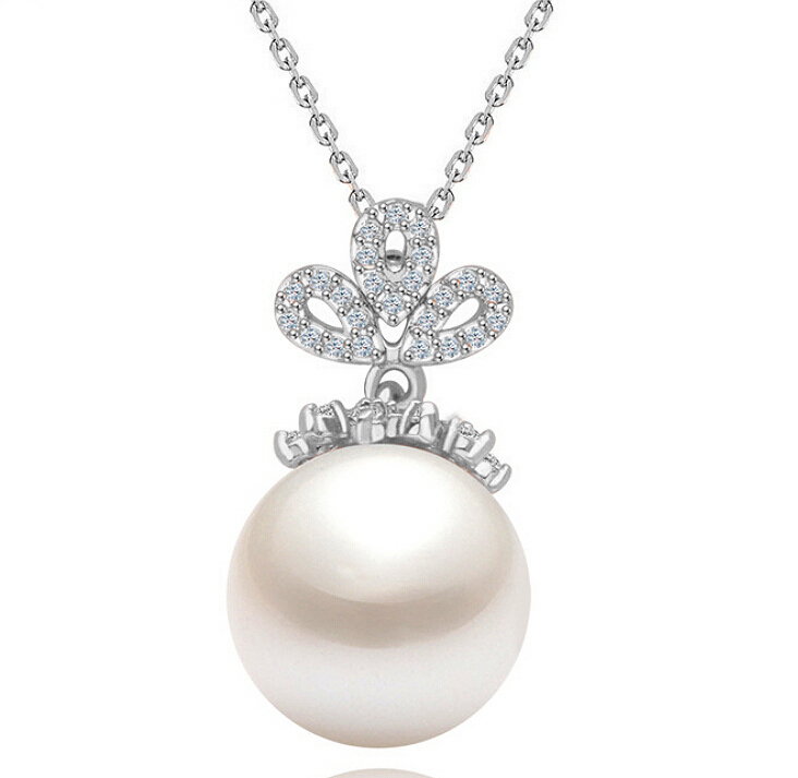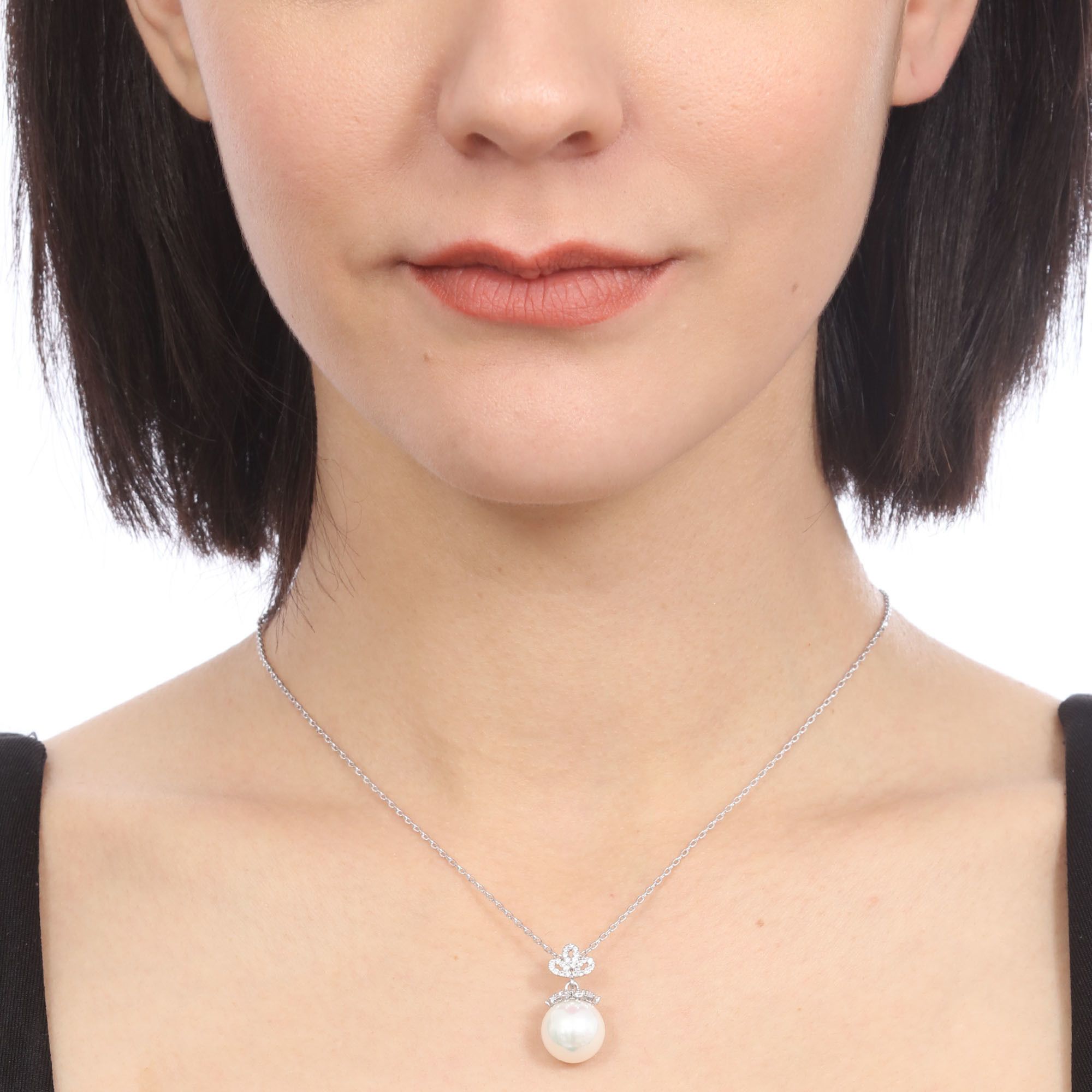 Dije con cadena en baño de oro blanco de 18 quilates, fino diseño con detalle de perla blanca e incrustaciones de cristales en color blanco. Fabricado en una estructura de aleación de platino con rodio sin níquel.