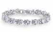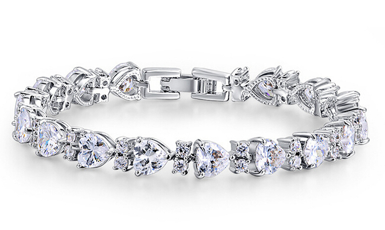 Pulsera en baño de oro blanco de 18 quilates, diseño de corazones con incrustaciones de cristales en color blanco. Fabricado en una estructura de aleación de platino con rodio sin níquel.