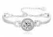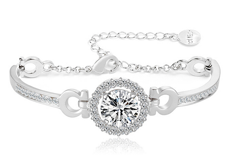 Pulsera en baño de oro blanco de 18 quilates, diseño de circulo con incrustaciones de cristales en color blanco. Fabricado en una estructura de aleación de platino con rodio sin níquel.