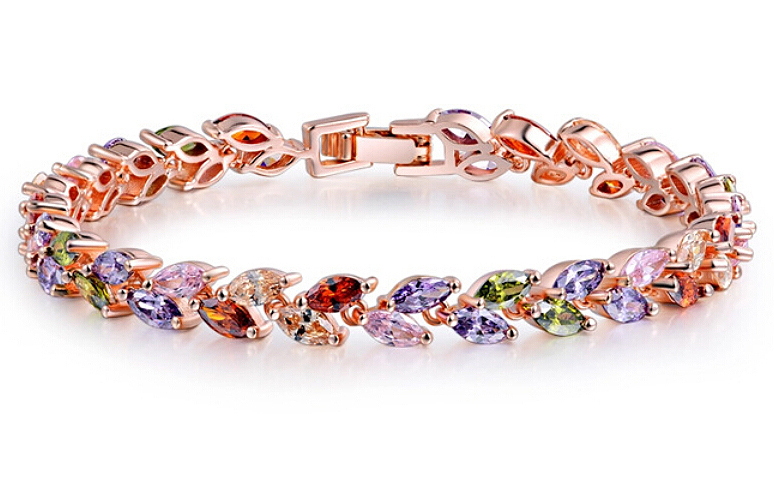Lindo brazalete en baño de oro rosa de 18 quilates, diseño de hojas con incrustaciones de cristales en colores. Fabricado en una estructura de aleación de platino con rodio sin níquel.