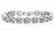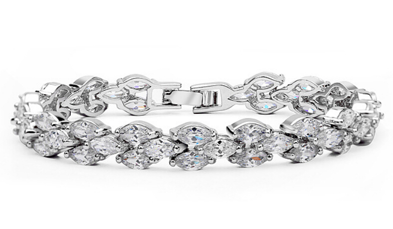 Elegante pulsera en baño de oro blanco de 18 quilates, fino diseño con incrustaciones de cristales corte marquesa en color blanco. Fabricado en una estructura de aleación de platino con rodio sin níquel.