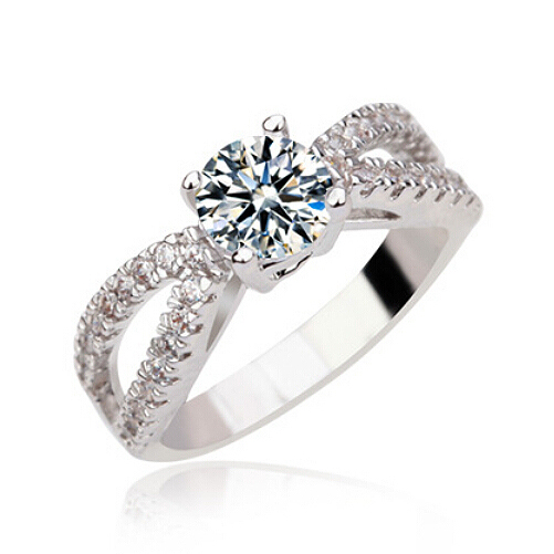 Delicado anillo en baño de oro blanco de 18 quilates, diseño de estilo infinito, con cristal blanco corte brillante e incrustaciones de cristales color blanco. Fabricado en una estructura de aleación de platino con rodio sin níquel.