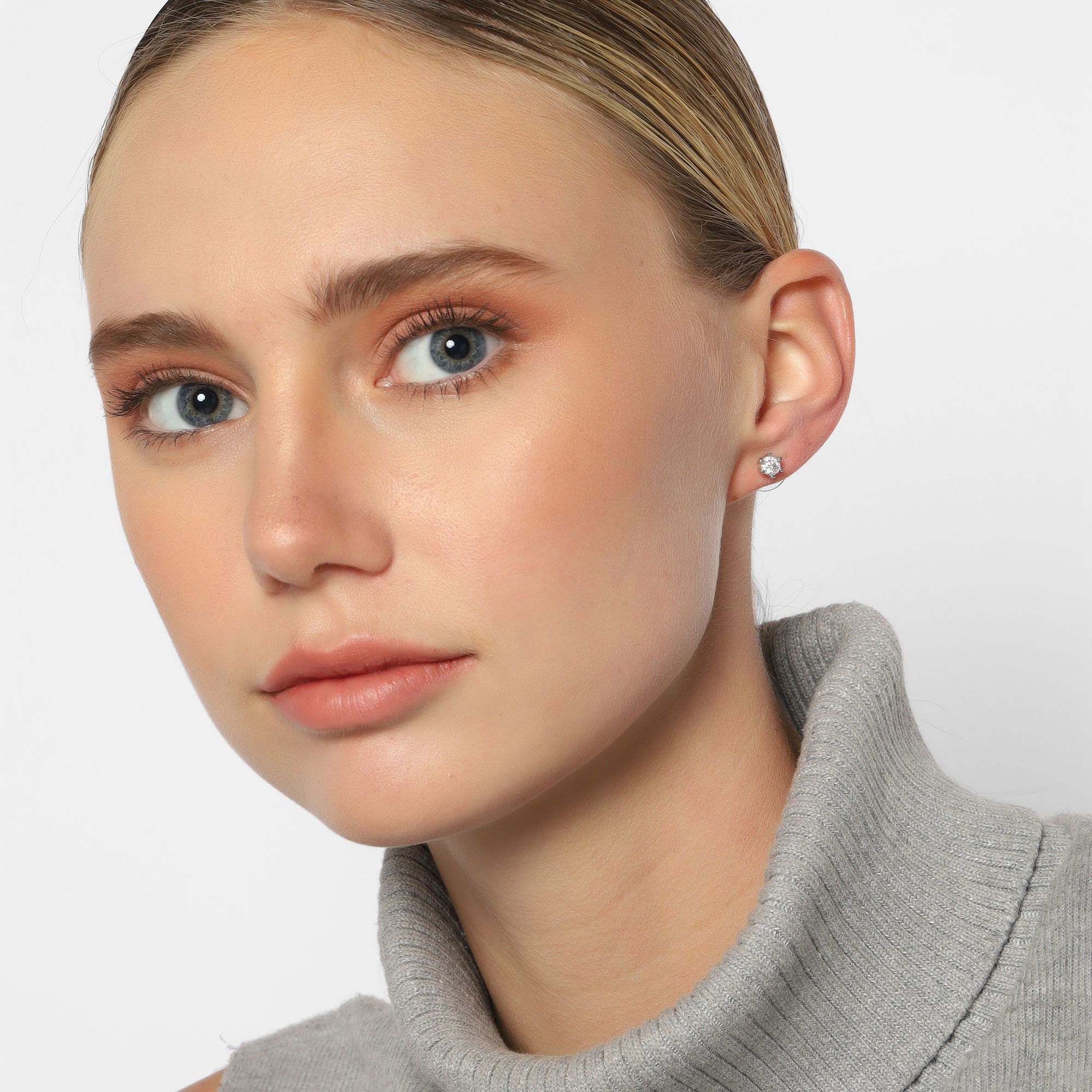 Aretes en baño de oro blanco de 18 quilates, con cristal blanco corte brillante. Fabricado en una estructura de aleación de platino con rodio sin níquel.