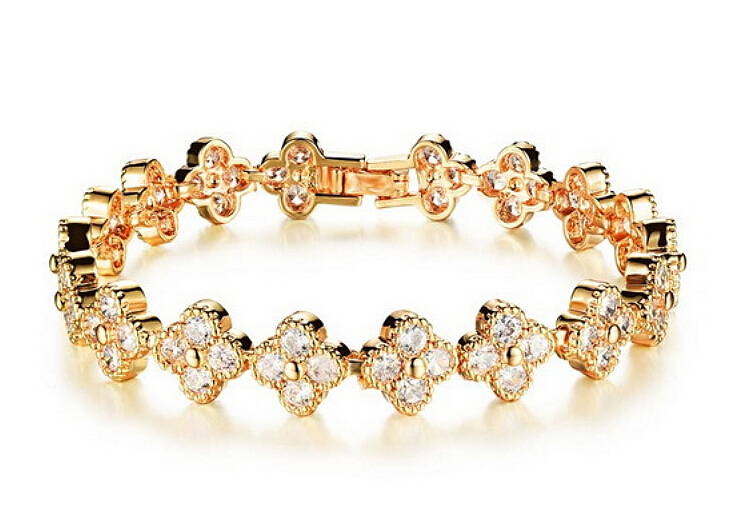 Hermoso brazalete en baño de oro amarillo de 18 quilates, con exquisitas incrustaciones de cristales en color blanco. Fabricado en una estructura de aleación de platino con rodio sin níquel.
