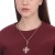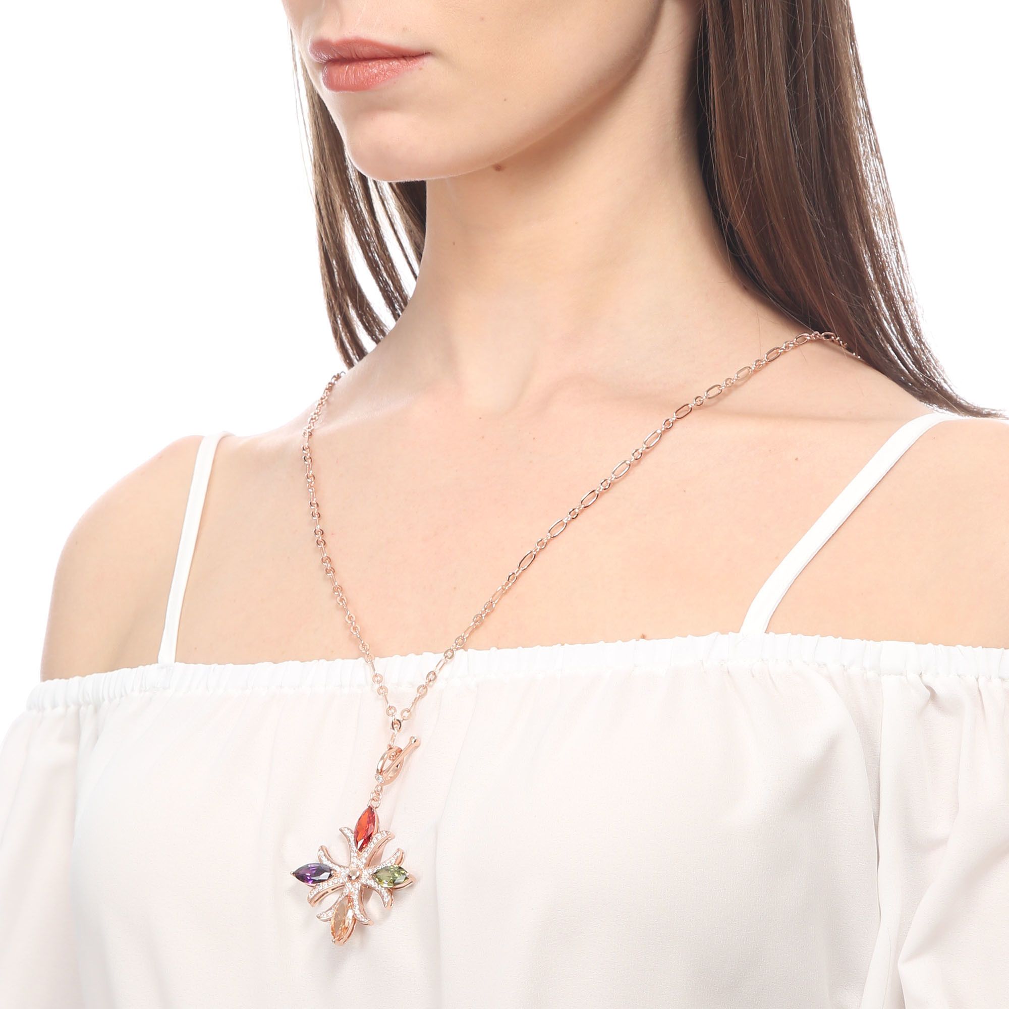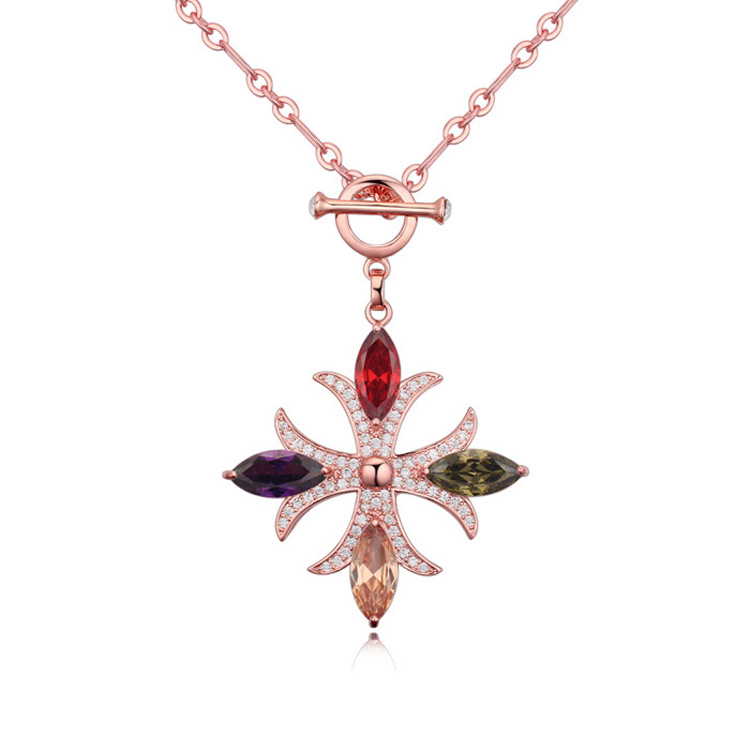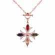 Collar en baño de oro rosa de 18 quilates, diseño de cruz con cristales corte marquesa en colores rojo, verde, ámbar y púrpura e incrustaciones de cristales blancos. Fabricado en una estructura de aleación de platino con rodio sin níquel.
