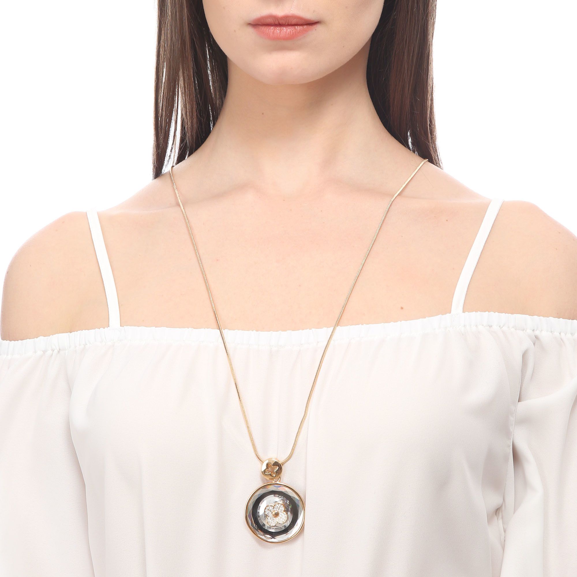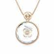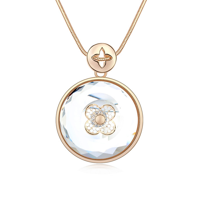 Elegante collar en baño de oro amarillo de 18 quilates, diseño de círculo con cristal blanco, detalles de flores doradas e incrustaciones de cristales blancos. Fabricado en una estructura de aleación de platino con rodio sin níquel.
