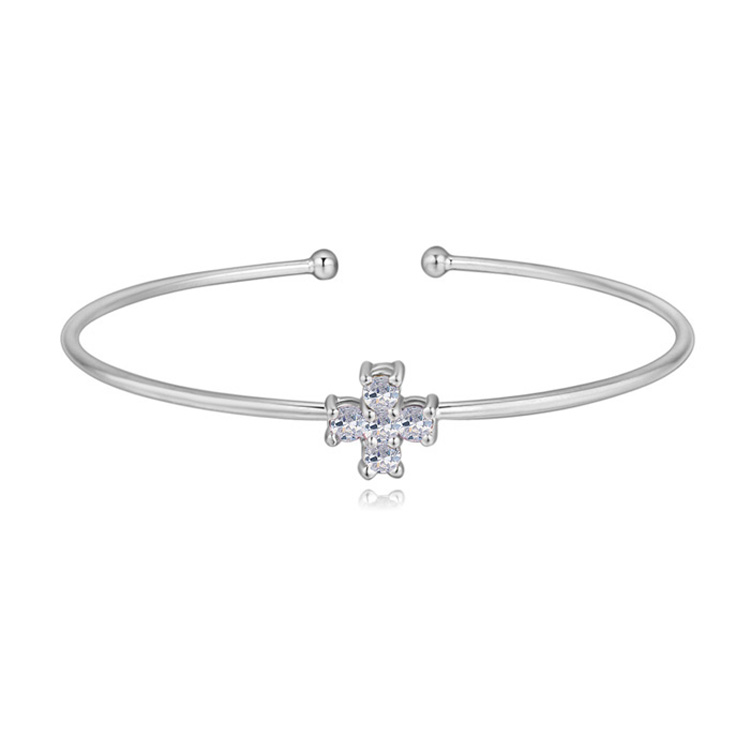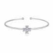 Lindo brazalete en baño de oro blanco de 18 quilates, diseño de cruz con incrustaciones de cristales en color blanco. Fabricado en una estructura de aleación de platino con rodio sin níquel.