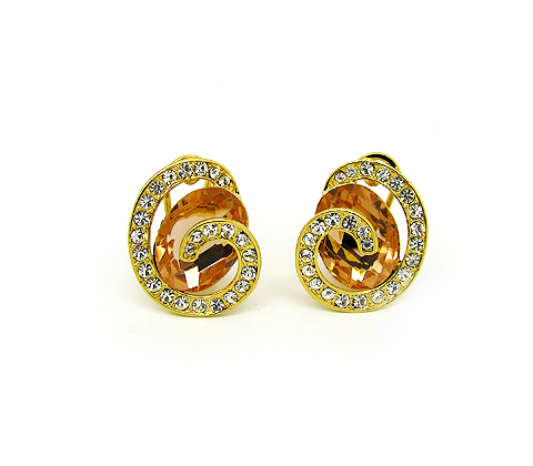 Aretes en baño de oro amarillo de 18 quilates, diseño en espiral con incrustacines de cristales blancos y cristal ámbar corte oval. Fabricado en una estructura de aleación de platino con rodio sin níquel.