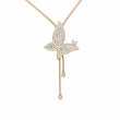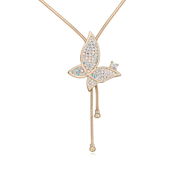 Collar para sweater en baño de oro amarillo de 18 quilates, diseño de mariposa con cristales en color tornasol. Fabricado en una estructura de aleación de platino con rodio sin níquel.