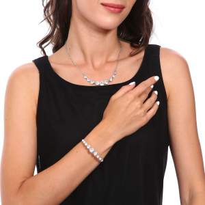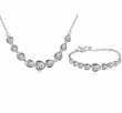 Hermoso juego de brazalete y dije en baño de oro blanco de 18 quilates , fino diseño con corazones engarzados e incrustaciones de cristales en color blanco. Fabricado en una estructura de aleación de platino con rodio sin níquel.