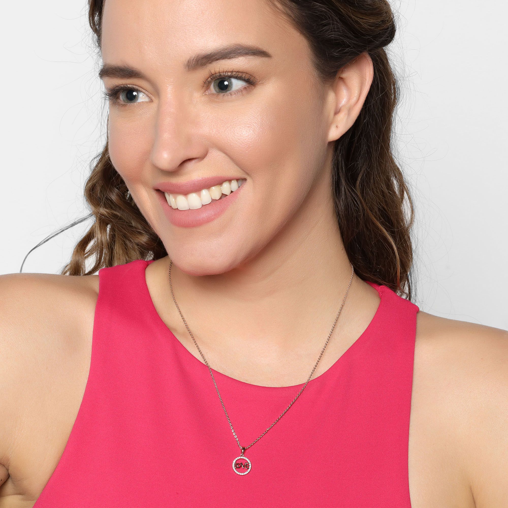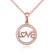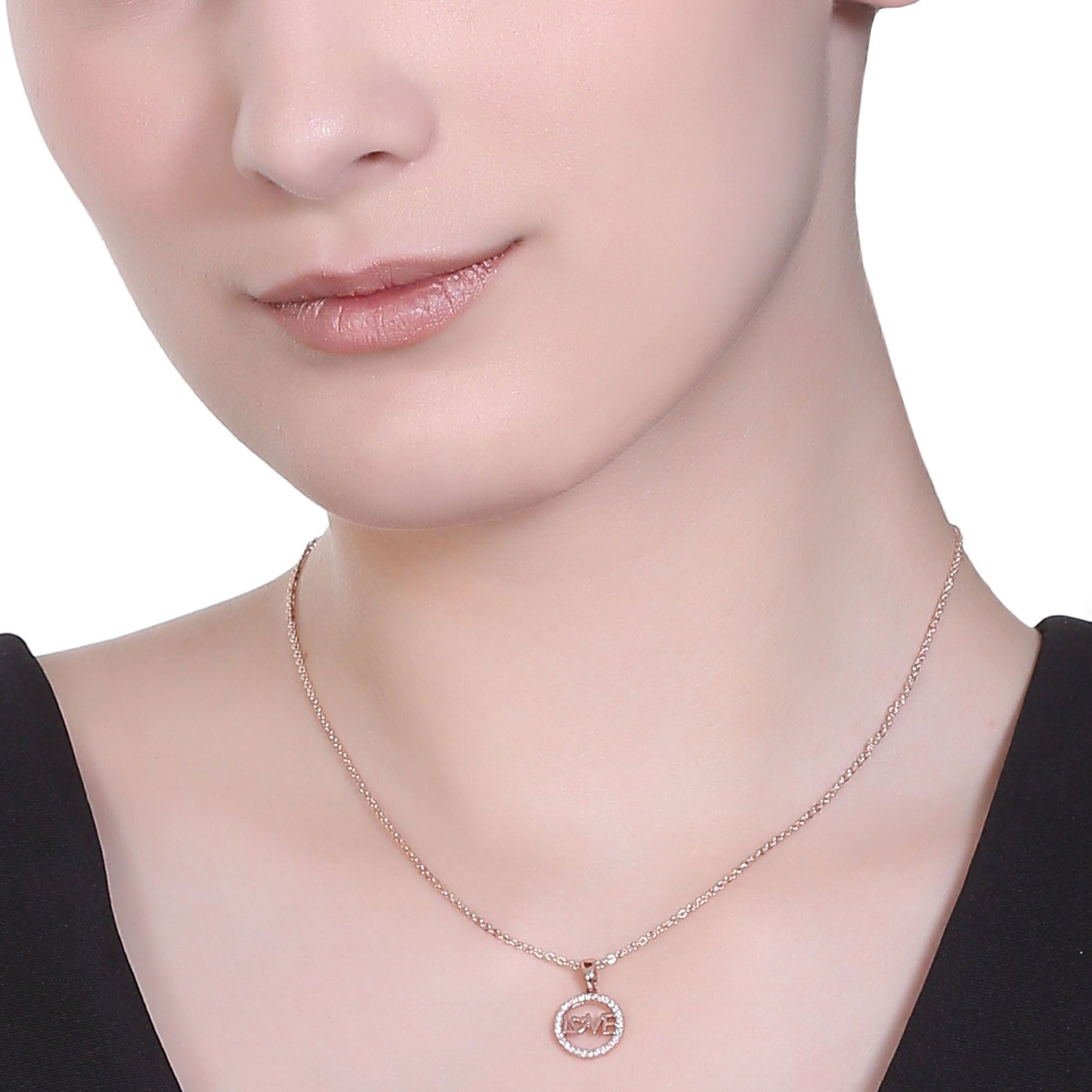 Precioso dije con cadena en baño de oro rosa de 18 quilates, fino diseño de aro, con la palabra "LOVE" e incrustaciones de cristales en color blanco. Fabricado en una estructura de aleación de platino con rodio sin níquel.