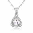 Hermoso dije en baño de oro blanco de 18 quilates, fino diseñ,o con cristal blanco corte trillion e incrustaciones de cristales en color blanco. Fabricado en una estructura de aleación de platino con rodio sin níquel.
