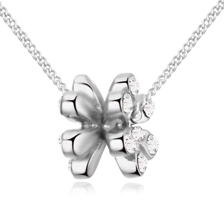 Dije con cadena en baño de oro blanco de 18 quilates, diseño de flor con incrustaciones de cristales en color blanco. Fabricado en una estructura de aleación de platino con rodio sin níquel.