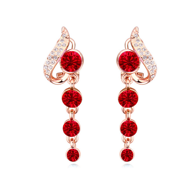 Elegantes pendientes con baño de oro rosa de 18 quilates, cristales rojos corte brillante e incrustaciones de cristales blancos. Fabricado en una estructura de aleación de platino con rodio sin níquel.