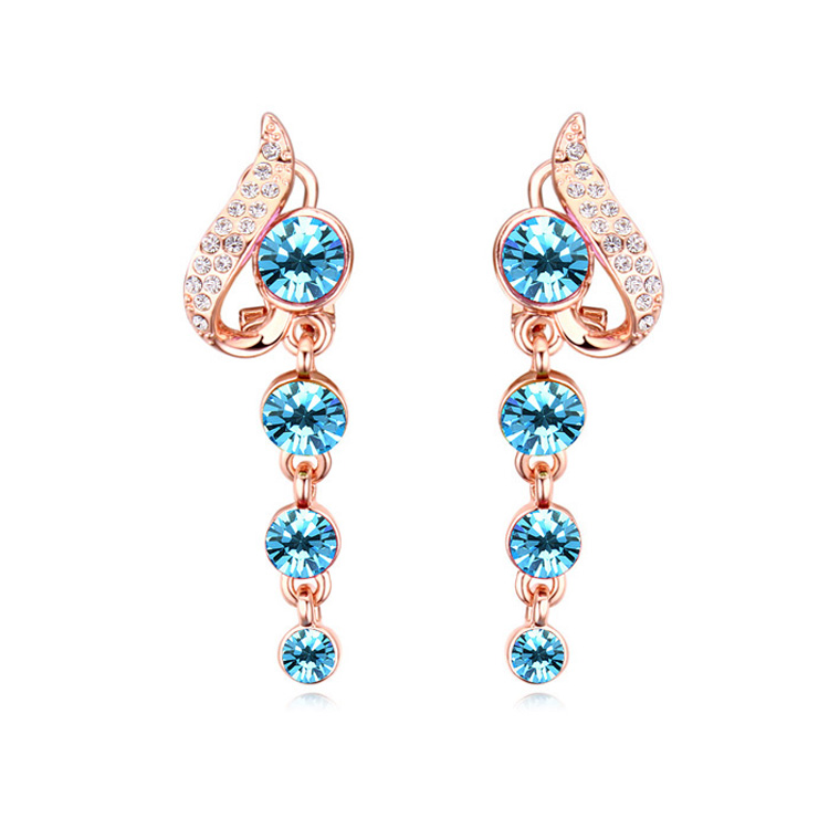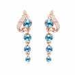 Lindos pendientes en baño de oro rosa de 18 quilates, con cristales azules corte brillante y diseño con incrustaciones de cristales blancos. Fabricado en una estructura de aleación de platino con rodio sin níquel.