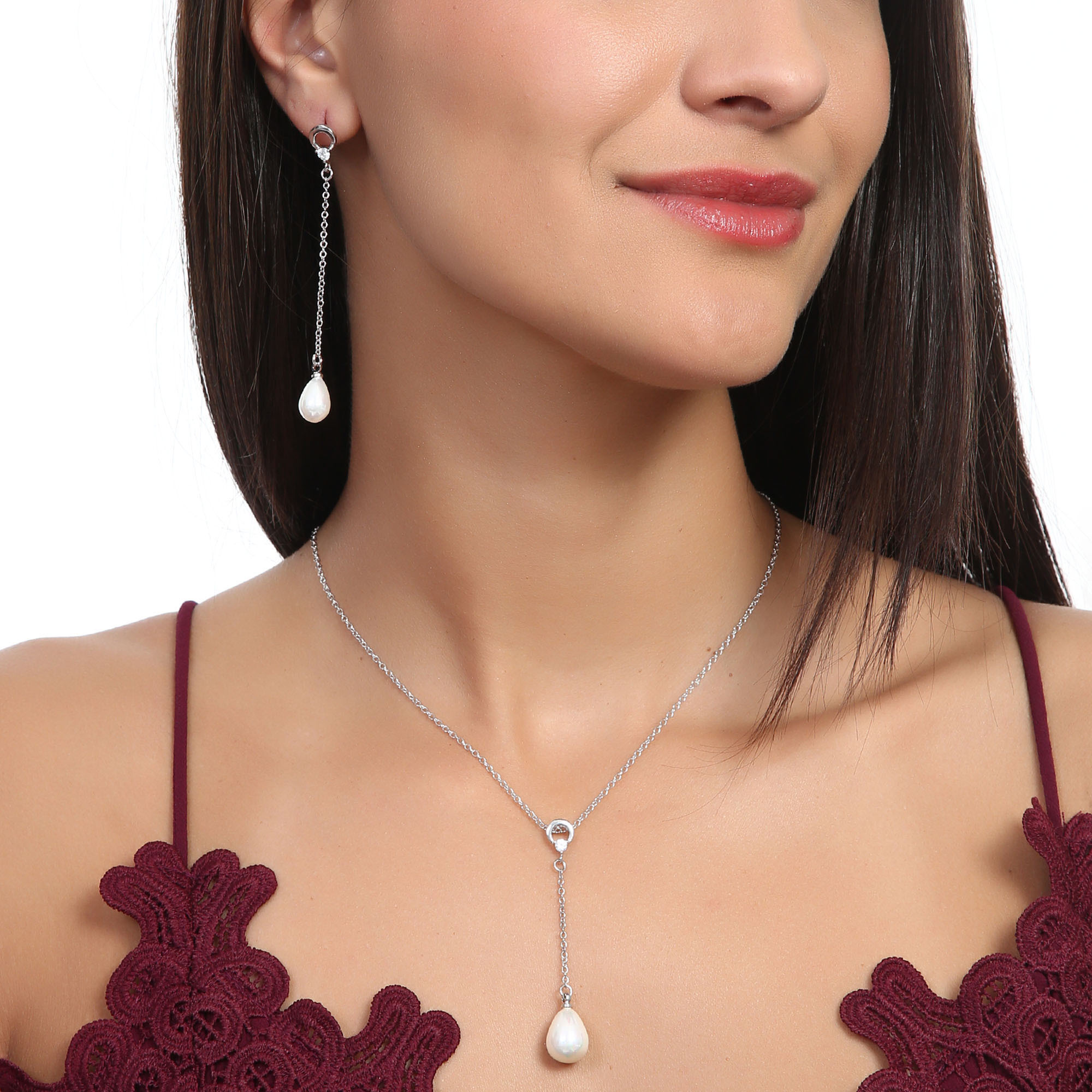 Hermoso juego de aretes y dije en baño de oro blanco de 18 quilates , fino diseño con gotas de perla blanca e incrustaciones de cristales en color blanco. Fabricado en una estructura de aleación de platino con rodio sin níquel.