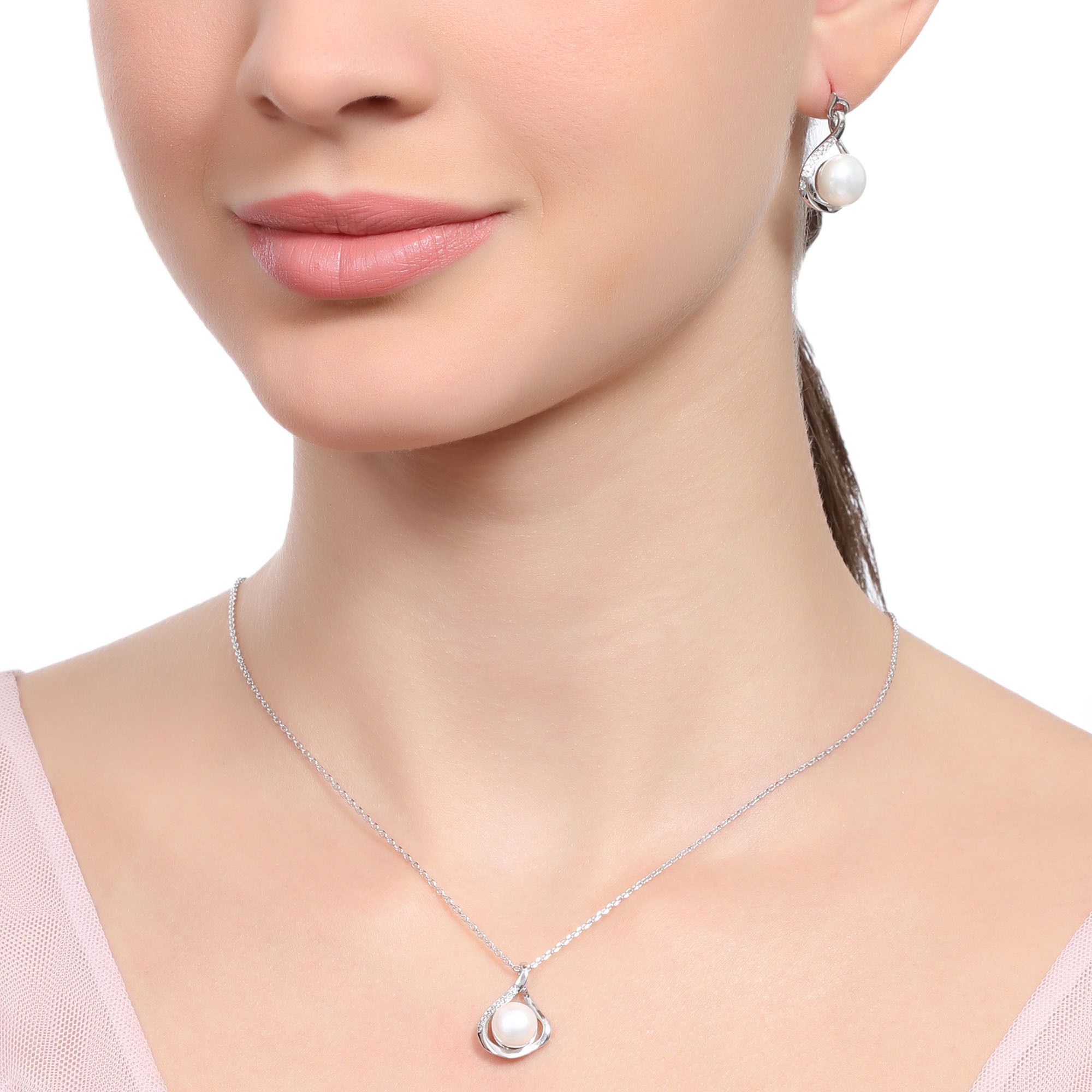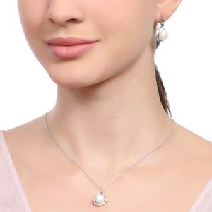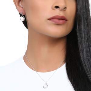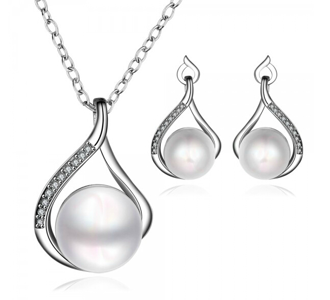 Hermoso juego de aretes y dije con cadena en baño de oro blanco de 18 quilates , fino diseño de gota, con perla blanca e incrustaciones de cristales en color blanco. Fabricado en una estructura de aleación de platino con rodio sin níquel.