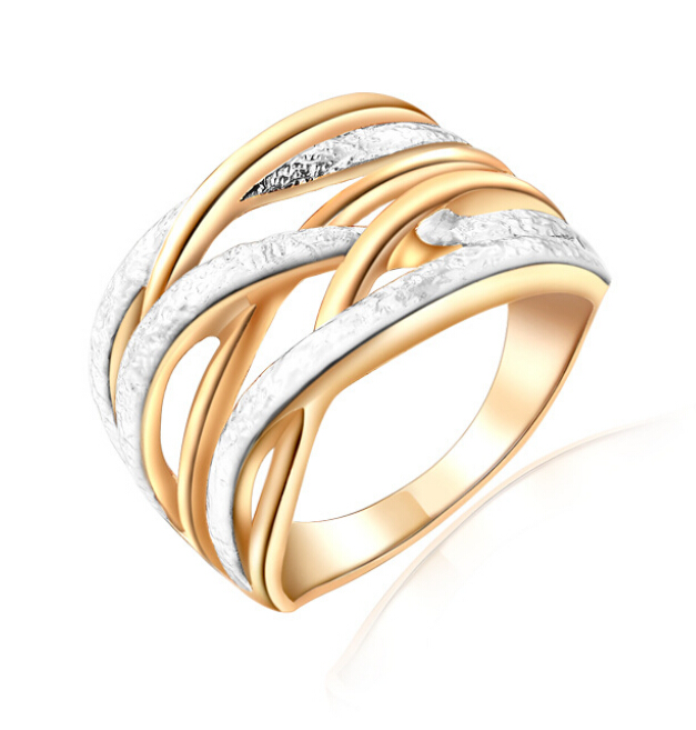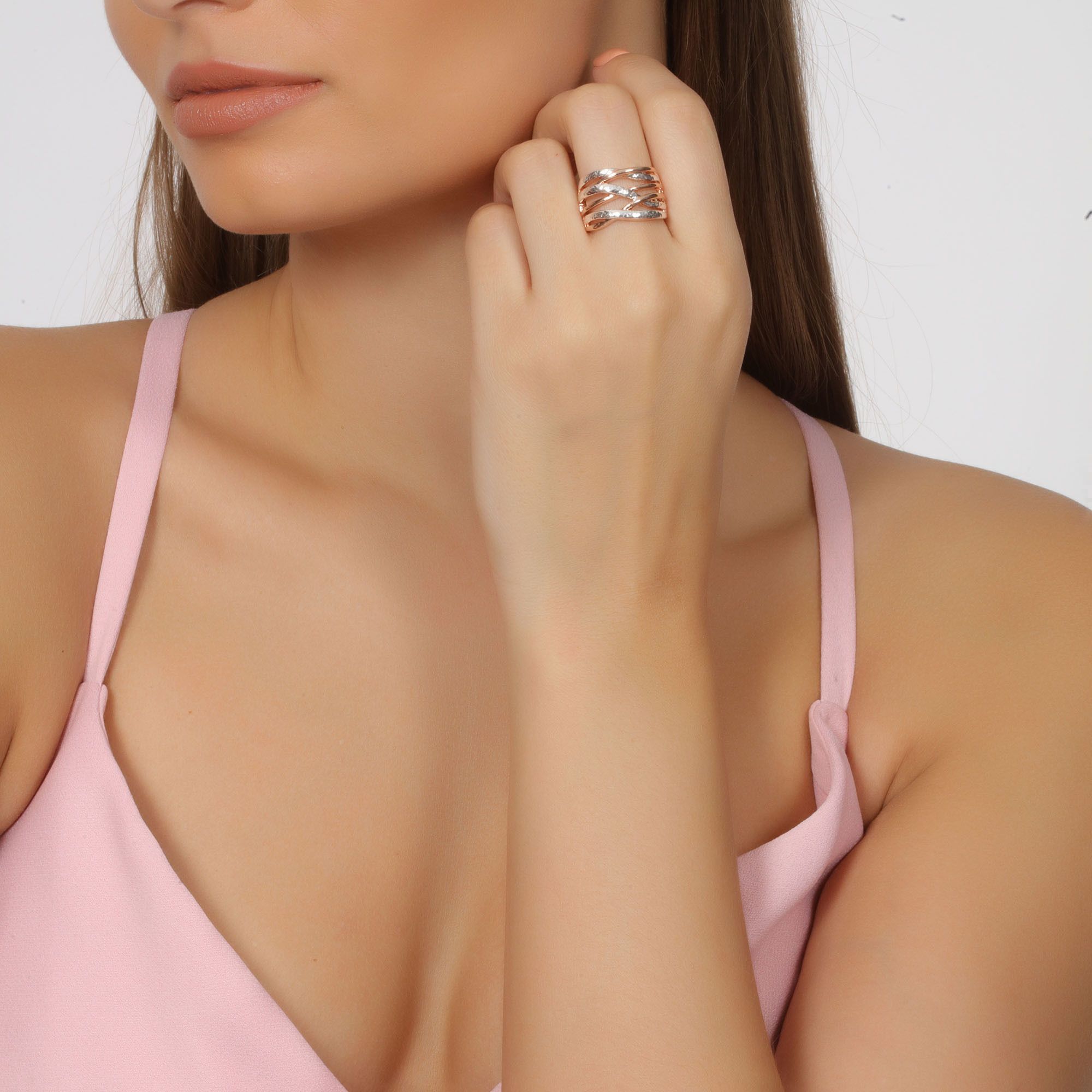 Elegante anillo, en baño de oro amarillo y blanco de 18 quilates, diseño cruzado y detalles en plateado con acabado corteza. Fabricado en una estructura de aleación de platino con rodio sin níquel.
