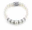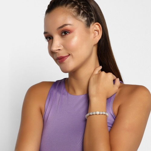 Precioso brazalete en baño de oro blanco de 18 quilates , con perlas cultivadas en color blanco, con incrustaciones de cristales en color blanco. Fabricado en una estructura de aleación de platino con rodio sin níquel.