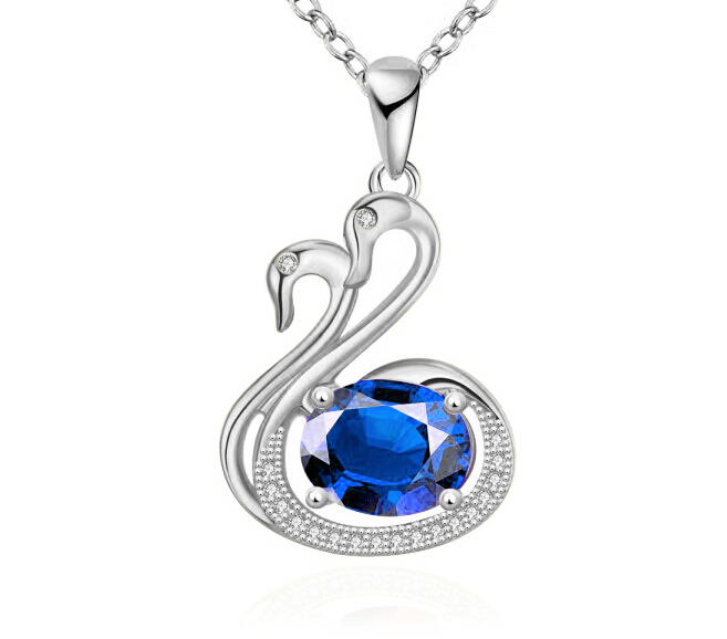 Hermoso dije con cadena en baño de oro blanco de 18 quilates, diseño de cisne con incrustación de cristal color azul y pequeñas chispas de cristales blancos. Fabricado en una estructura de aleación de platino con rodio sin níquel.