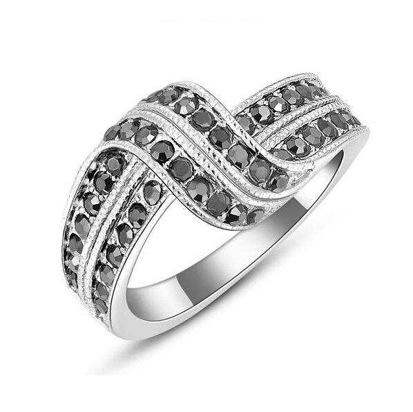 Anillo en baño de oro blanco de 18 quilates, original diseño estilo torcido con incrustaciones de cristales color humo. Fabricado en una estructura de aleación de platino con rodio sin níquel.