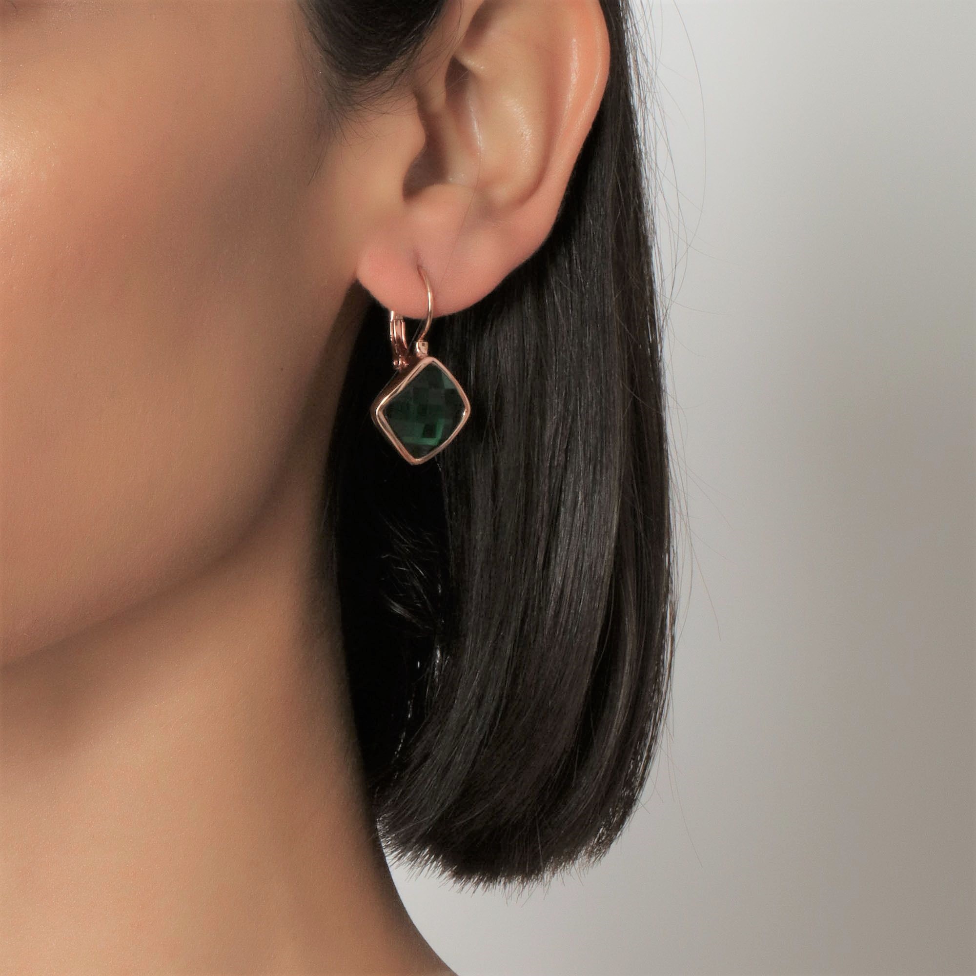 Lindos aretes en baño de oro rosa de 18 quilates, con cristal color esmeralda corte cojín. Fabricado en una estructura de aleación de platino con rodio sin níquel.