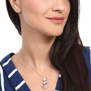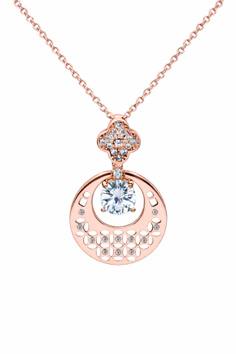 Lindo dije en baño de oro rosa de 18 quilates, diseño de círculos y flor calados con incrustaciones de cristales en color blanco. Fabricado en una estructura de aleación de platino con rodio sin níquel.