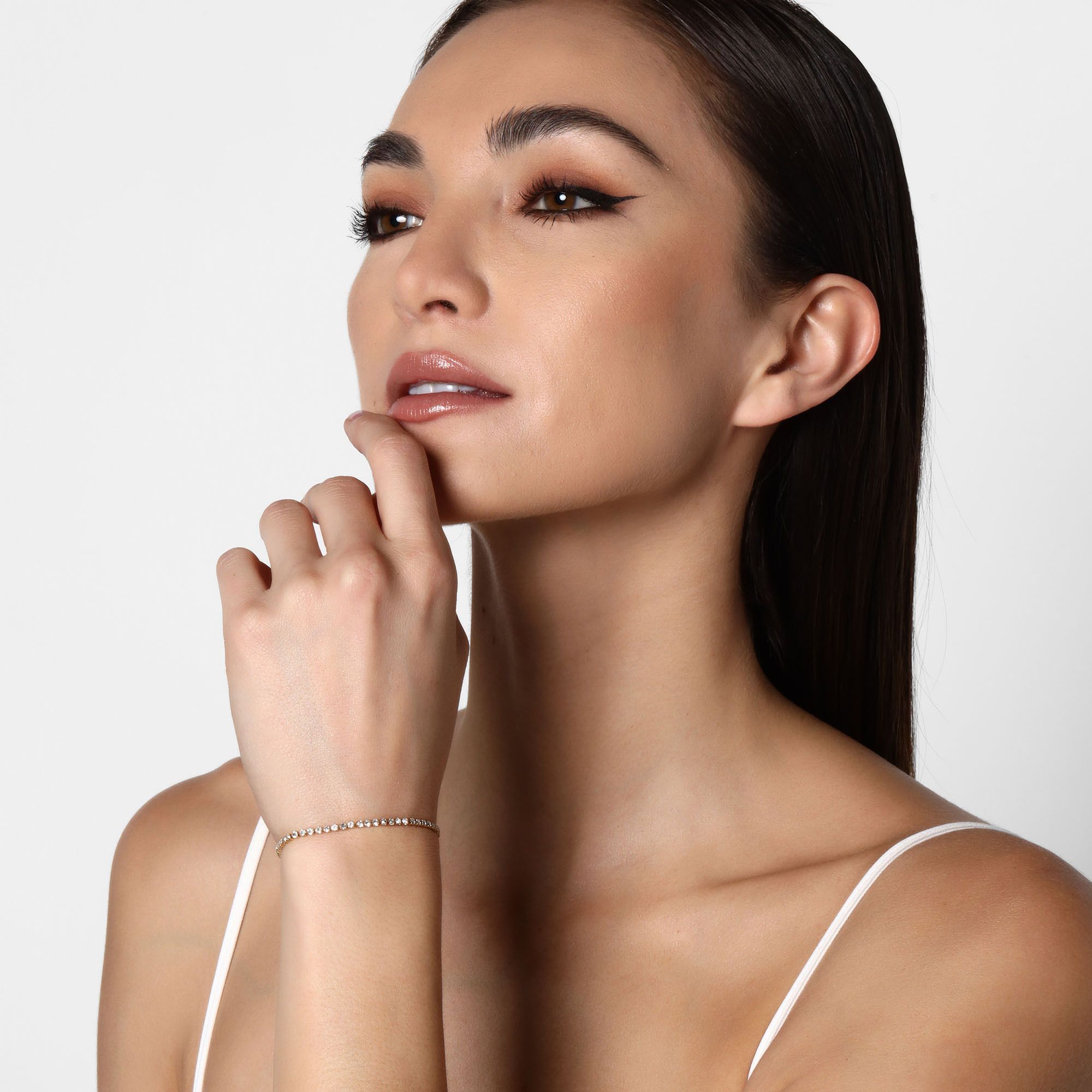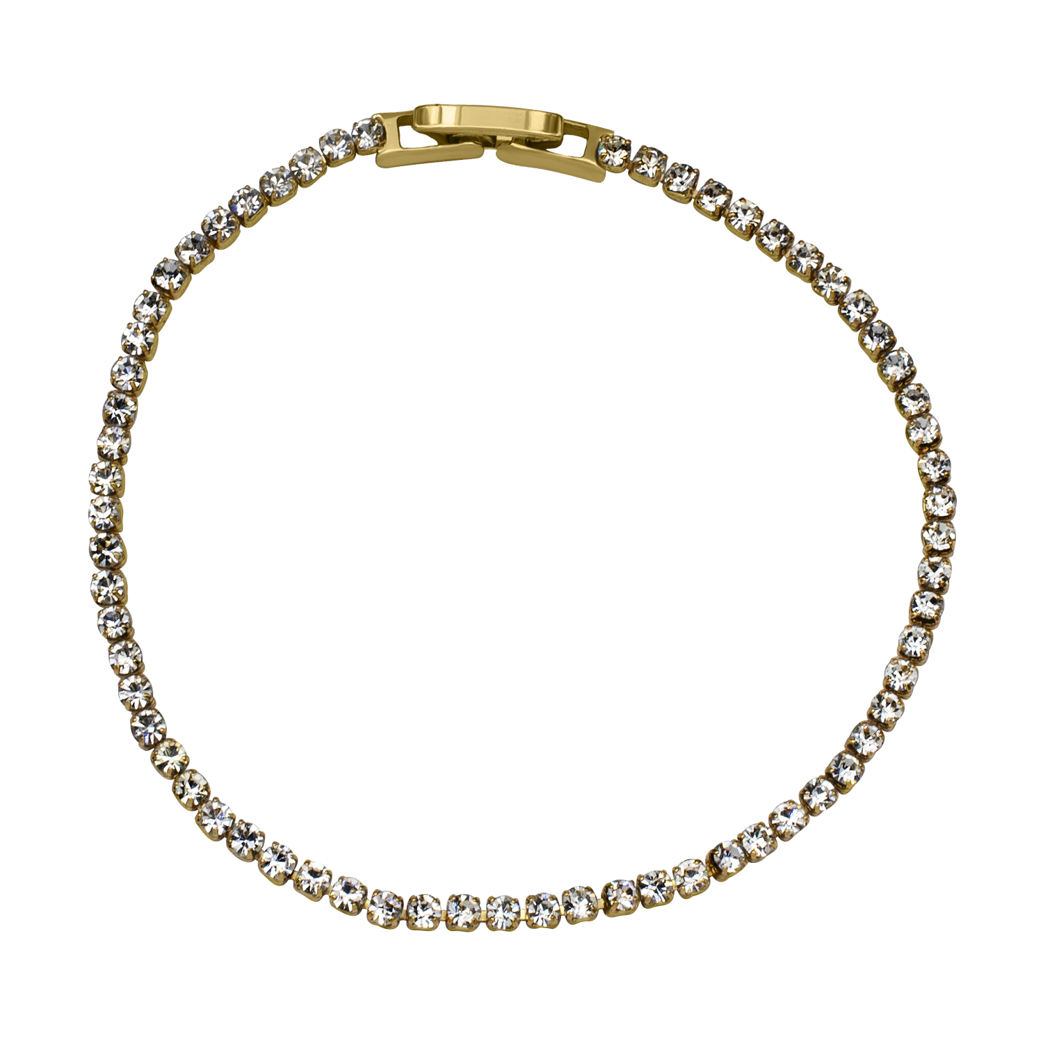 Hermosa pulsera en baño de oro amarillo de 18 quilates , exquisito diseño con incrustaciones de cristales blanco. Fabricado en una estructura de aleación de platino con rodio sin níquel.