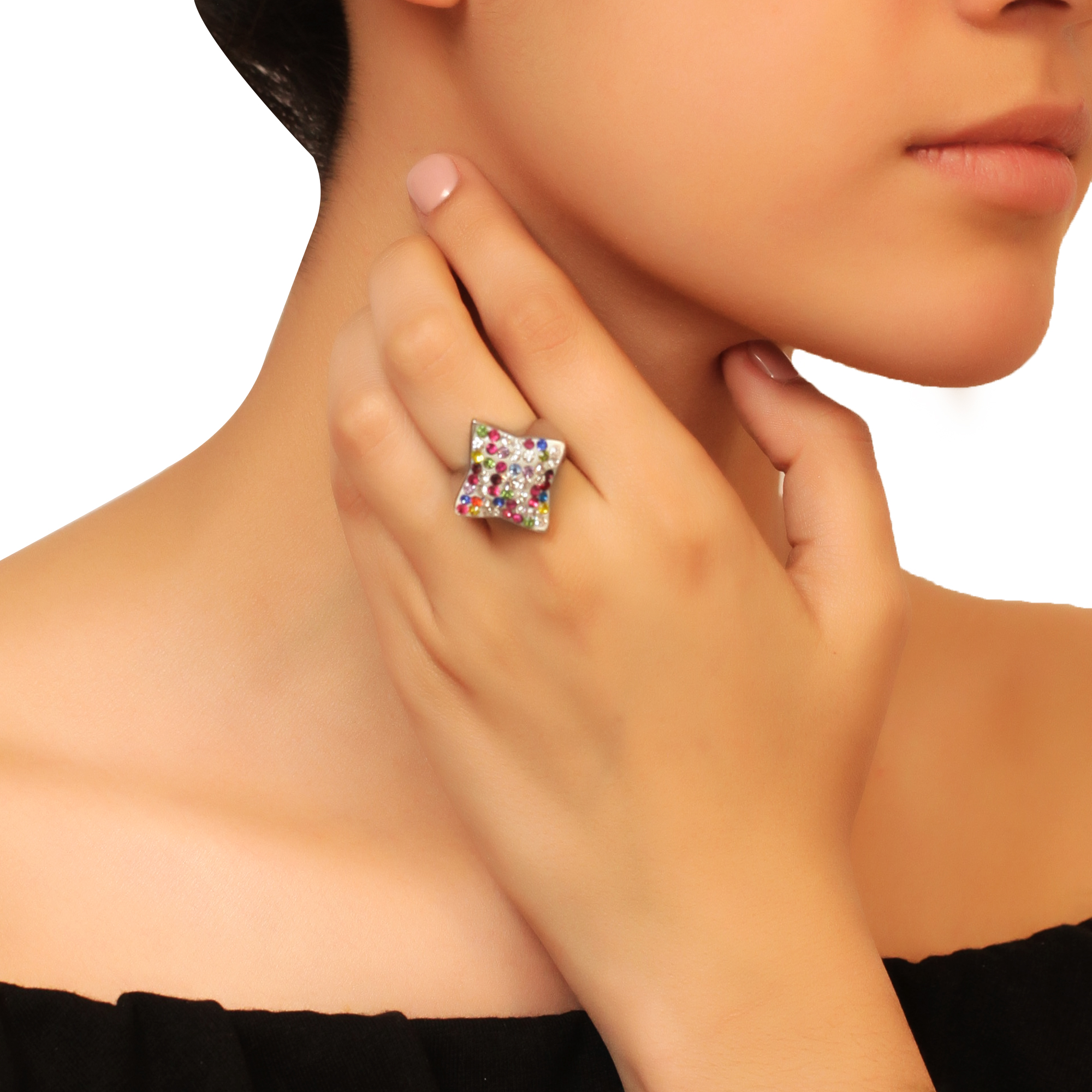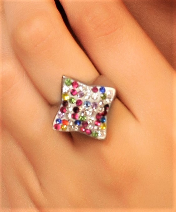 Anillo en baño de oro blanco de 18 quilates, fino diseño estilo estrella, con incrustaciones de cristales en colores azul, rojo, amarillo, verde, lila y blanco. Fabricado en una estructura de aleación de platino con rodio sin níquel.