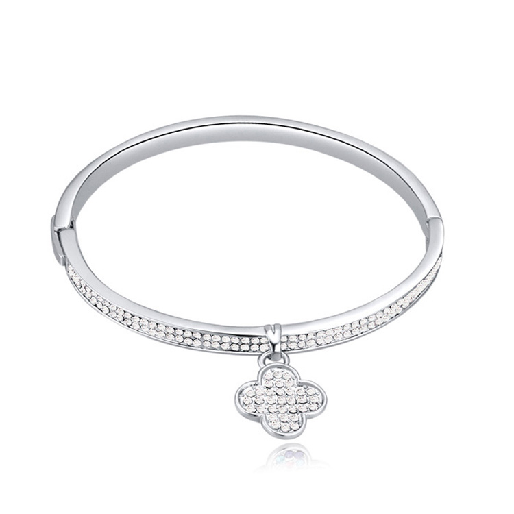 Brazalete en baño de oro blanco de 18 quilates , fino diseño con dije de trébol incrustaciones de cristales en color blanco. Fabricado en una estructura de aleación de platino con rodio sin níquel.