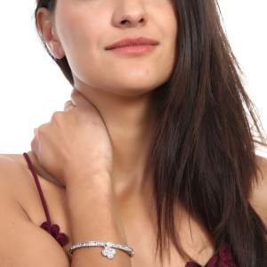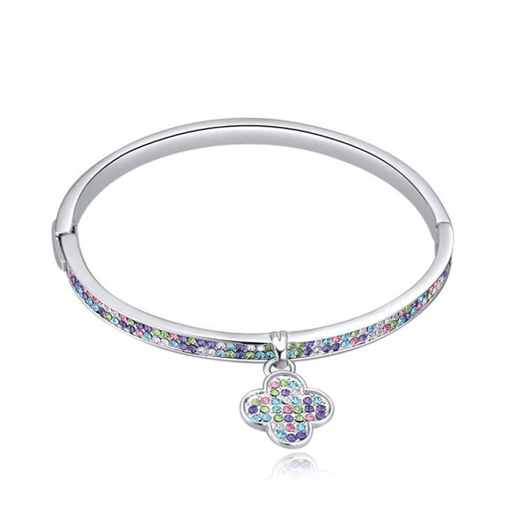 Brazalete en baño de oro blanco de 18 quilates , fino diseño con trébol e incrustaciones de cristales en colores. Fabricado en una estructura de aleación de platino con rodio sin níquel.