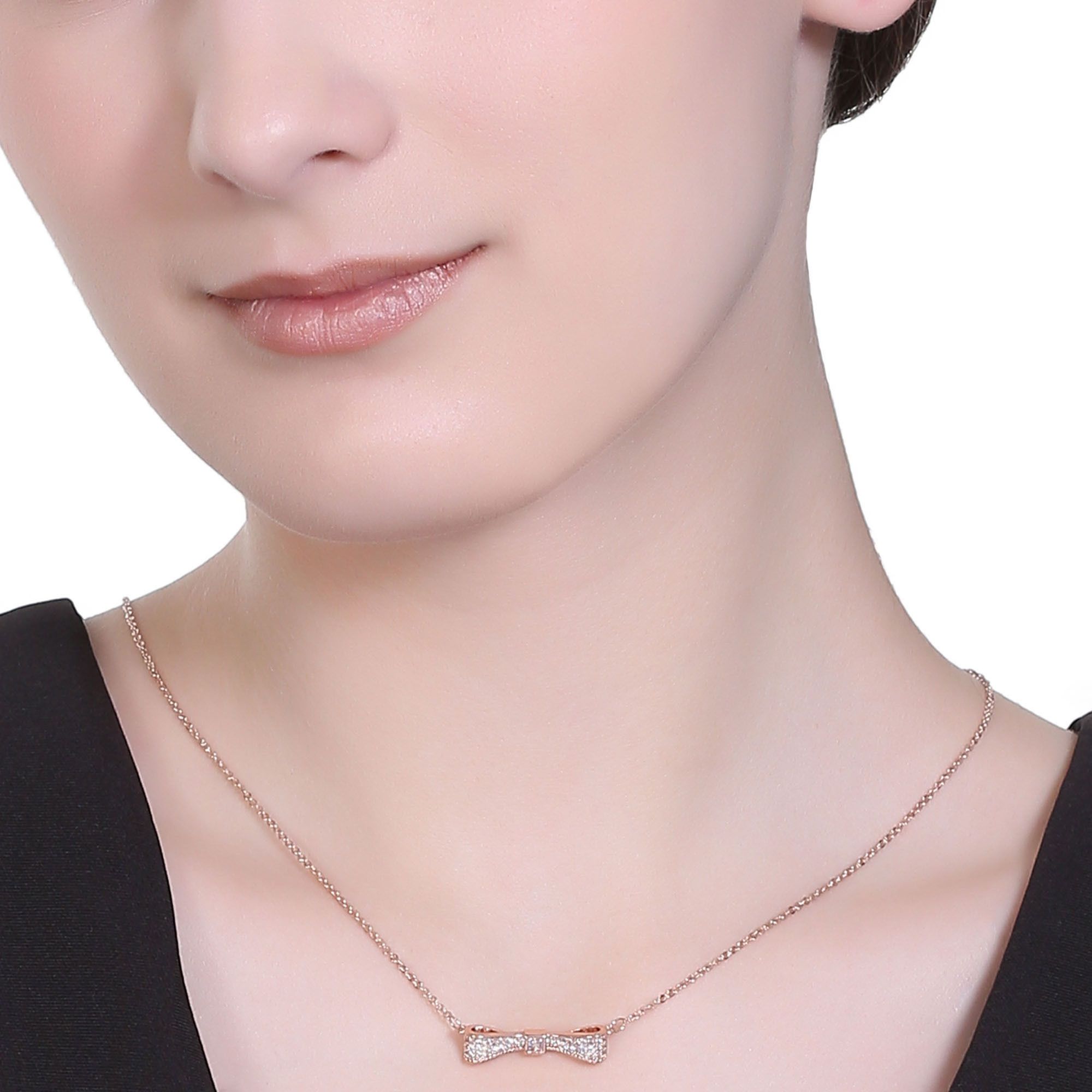 Collar en baño de oro rosa de 18 quilates, diseño de moño con incrustaciones de cristales en color blanco. Fabricado en una estructura de aleación de platino con rodio sin níquel.