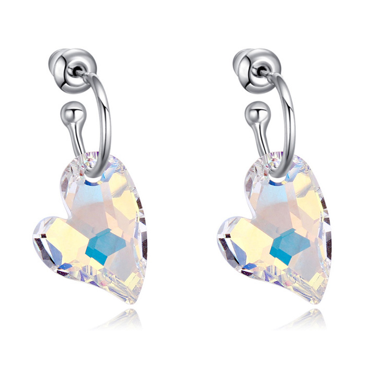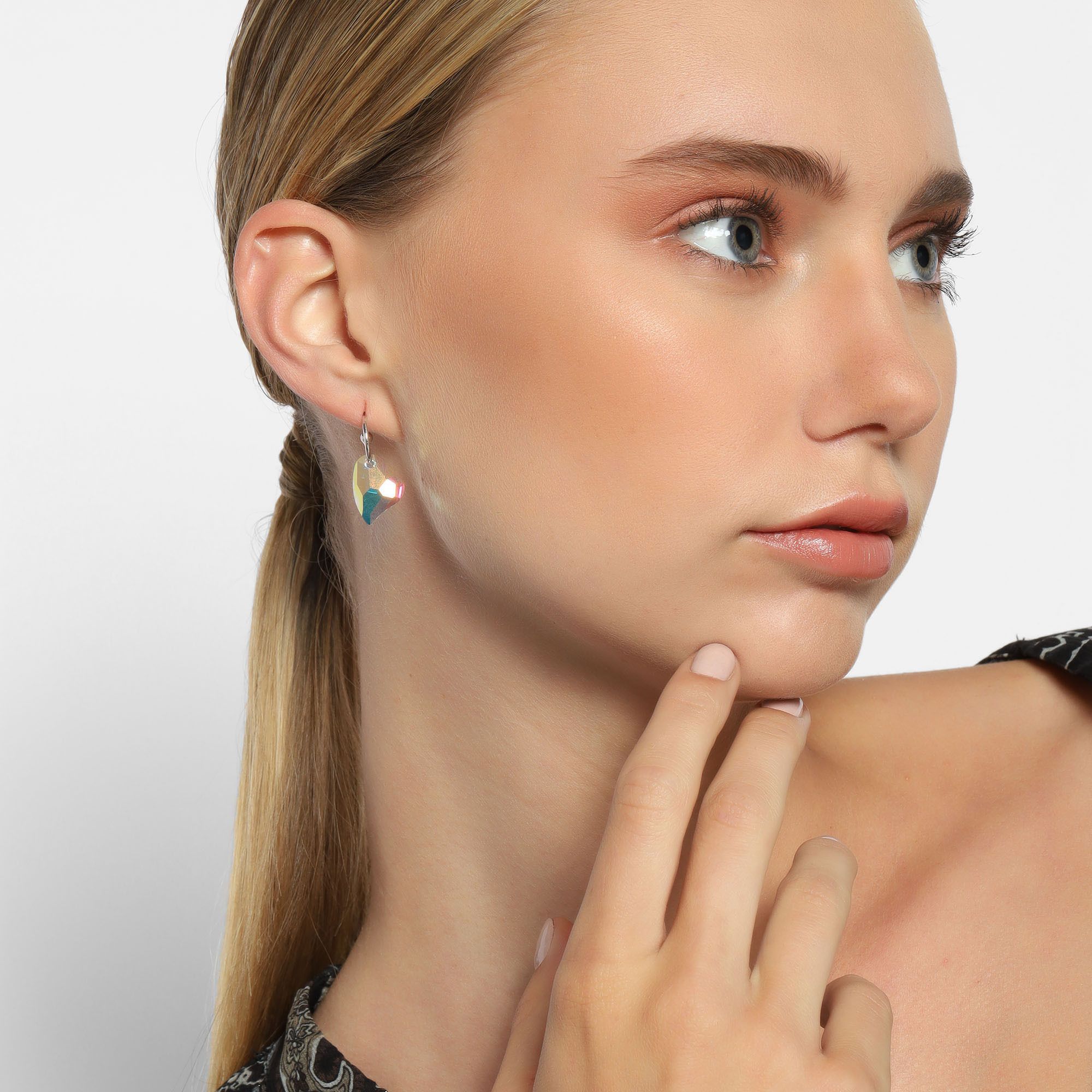 Aretes en baño de oro blanco de 18 quilates, con cristal aurora boreal corte corazón. Fabricado en una estructura de aleación de platino con rodio sin níquel.