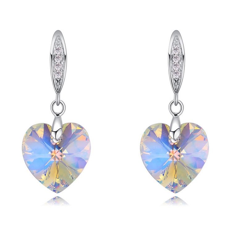 Aretes en baño de oro blanco de 18 quilates, con cristal aurora boreal corte corazón e incrustaciones de cristales en color blanco. Fabricado en una estructura de aleación de platino con rodio sin níquel.
