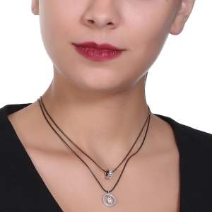 Collar en baño de oro blanco de 18 quilates, efecto cobrizo, diseño de aro y cilindro plateado, cristal tornasol corte brillante e incrustaciones de cristales en color blanco. Fabricado en una estructura de aleación de platino con rodio sin níquel.